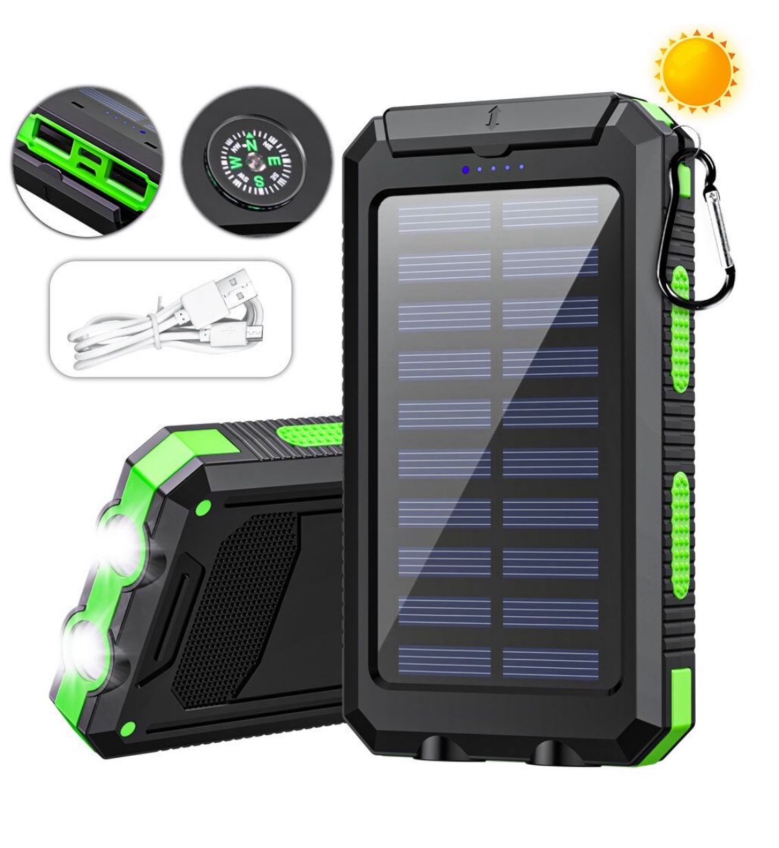 • Rugged Design: Water-resistant, shockproof, and dustproof — perfect for outdoor activities such as camping or hiking. • Solar Charging: Built-in solar panel allows recharging under direct sunlight, providing an emergency power source. • Portable: Comes with a carabiner/clip to easily attach to a backpack for hands-free use while on the go. • Extra Functions: Equipped with a built-in LED flashlight, usable as an emergency lamp or in SOS mode at night. • Compatibility: Can charge mobile devices such as phones and tablets through its USB ports.