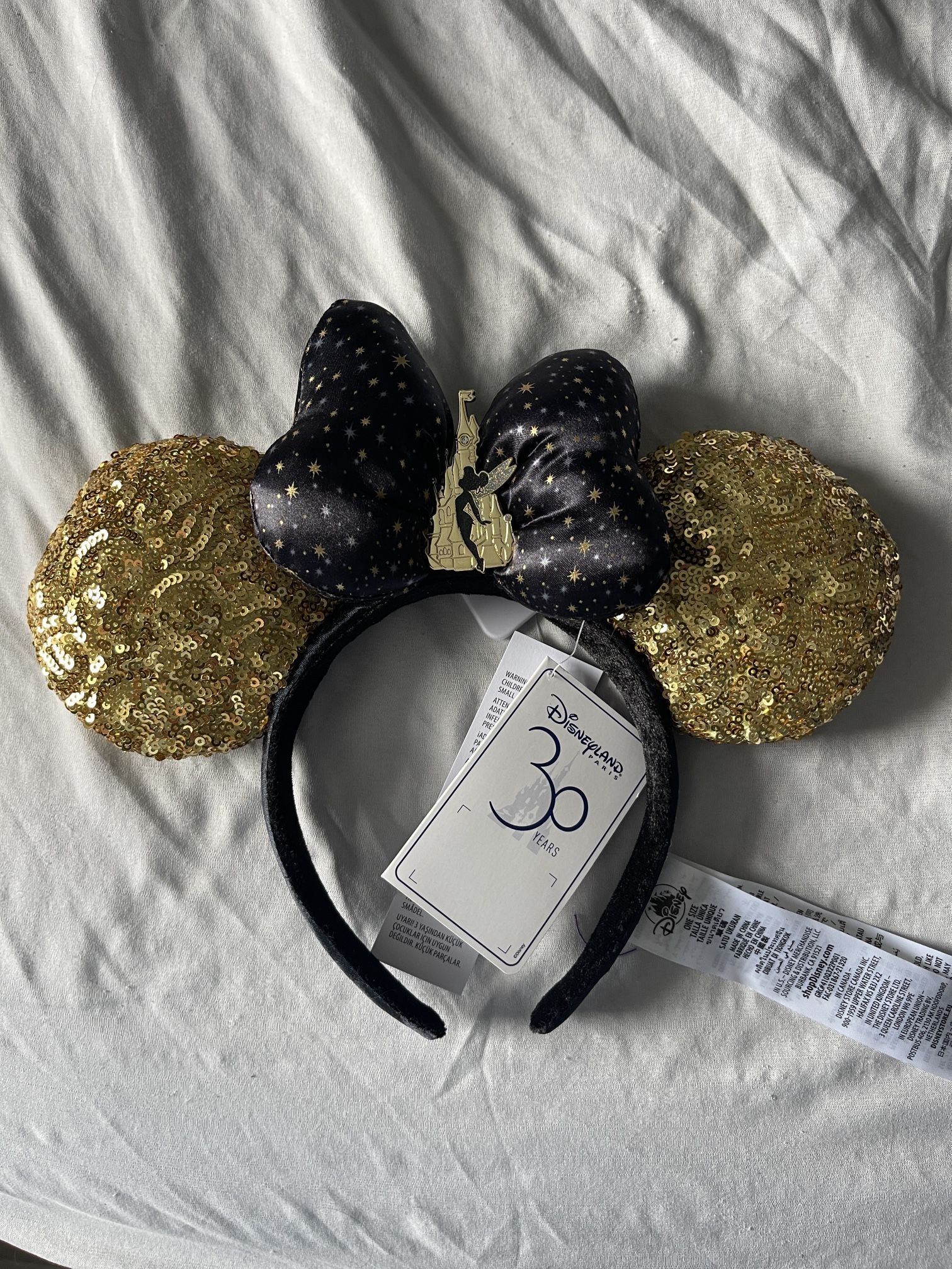 Celebrate 30 magical years of Disneyland Paris with this glittering set of sequin Minnie ears featuring Tinker Bell and Sleeping Beauty castle at the bow's center. Soft padded Minnie Mouse Ears