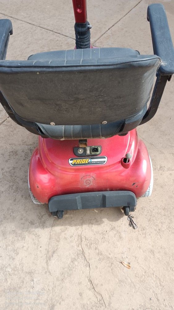 Red victory mobility scooter. This was rebuilt many years ago. It has been sitting around outside, mostly covered. We think all it needs is a battery, but to be honest we are not sure.