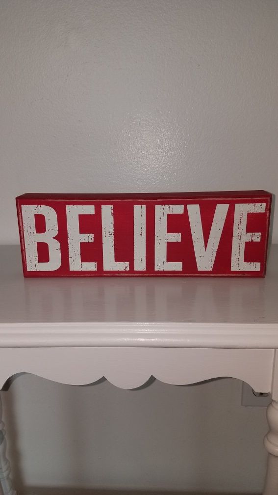 NWT 12" long 4"tall 2" thick, "BELIEVE" wood sign. Can be used for Christmas or all year long. Stands or could be hung up. Easy to stand doesn't fall over. Distressed look. Pick up. Thank you for looking. Have a Blessed Day!