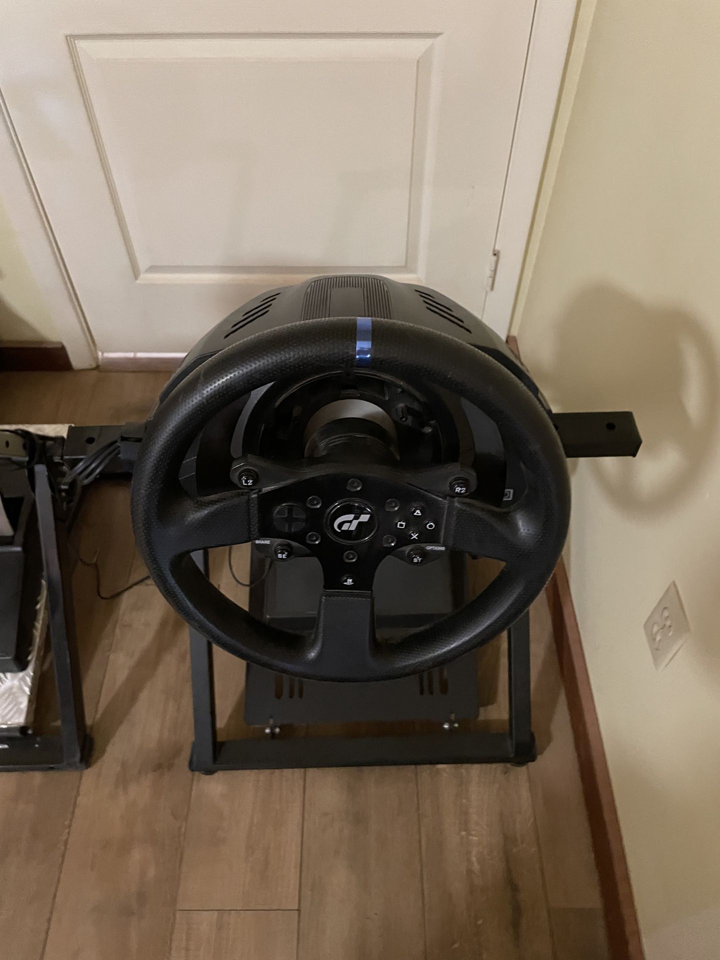 Thrustmaster T300 RS GT Edition Racing Wheel and pedal set mounted on a stand. This high-end racing simulator is officially licensed by Gran Turismo and is compatible with PS5, PS4, and PC platforms. Basically new 280 obo