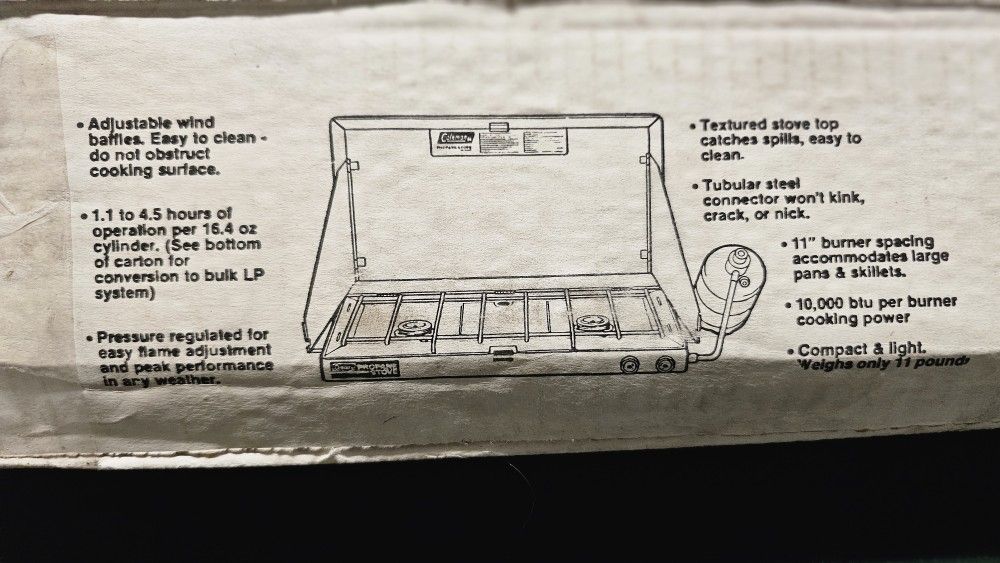Selling a classic, reliable Coleman Two Burner Propane Stove. This is model 5430B700, a quality vintage piece perfect for camping, tailgating, or emergency use. Condition: The stove itself is in great condition, used only once (see photos). The original box is a bit worn, but the contents are clean. Features: Pressure regulated for consistent performance in any weather. Textured stove top catches spills and is easy to clean. Included: Comes in the original box. Propane cylinder sold separately.
