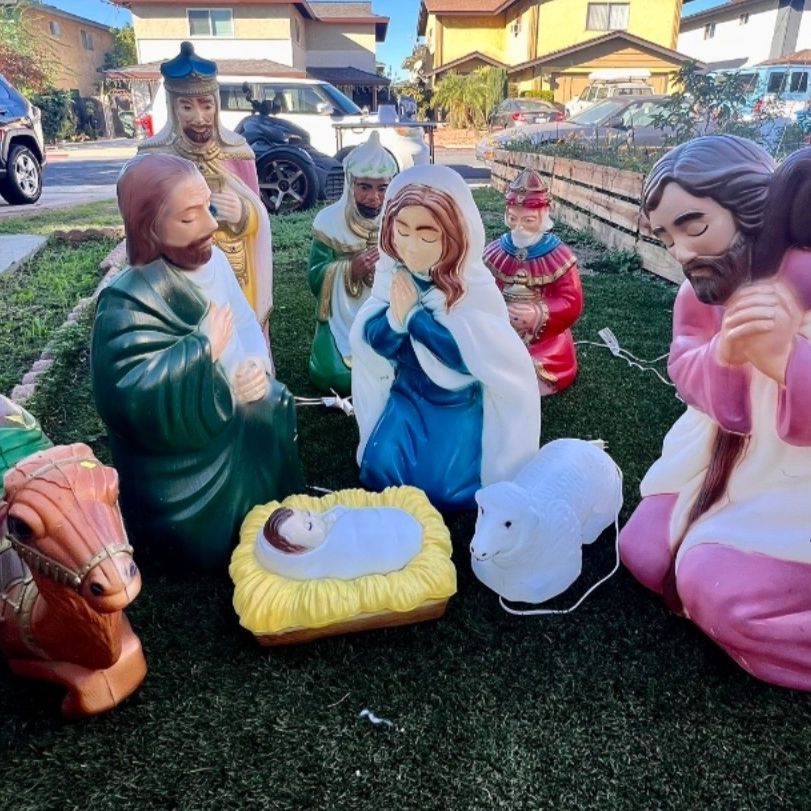 Made by Empire. Christmas Nativity 9 Pieces Lighted Set. Includes the Holy Family, 3 Piece Set with Mary Joseph, Baby Jesus with light cords. Wiseman's King's, 3 Pieces Set, includes The Light Cords. Camel with Light Cord. Barn Animals Sheep π with Light Cord. The Good Shepherd with Light Cord. All are in Great Condition. Indoor and Outdoor. You are getting all 9 Piece Set. You are getting Quality Blow Molds, Great Colors, No Dents, Breakage, No Damage. View all Photos. Brand is Empire. Beautiful Colors. Great Replacement Set for this Holiday 2026. Selling as a Set, I am willing to separate, if you are looking for a Particular Piece. Pick up in Pico Rivera, 90660. Ask me any questions? I have more great Christmas Deals in my other Listings, take a Peak. Thanks for looking! Price $350.00 Cash.
