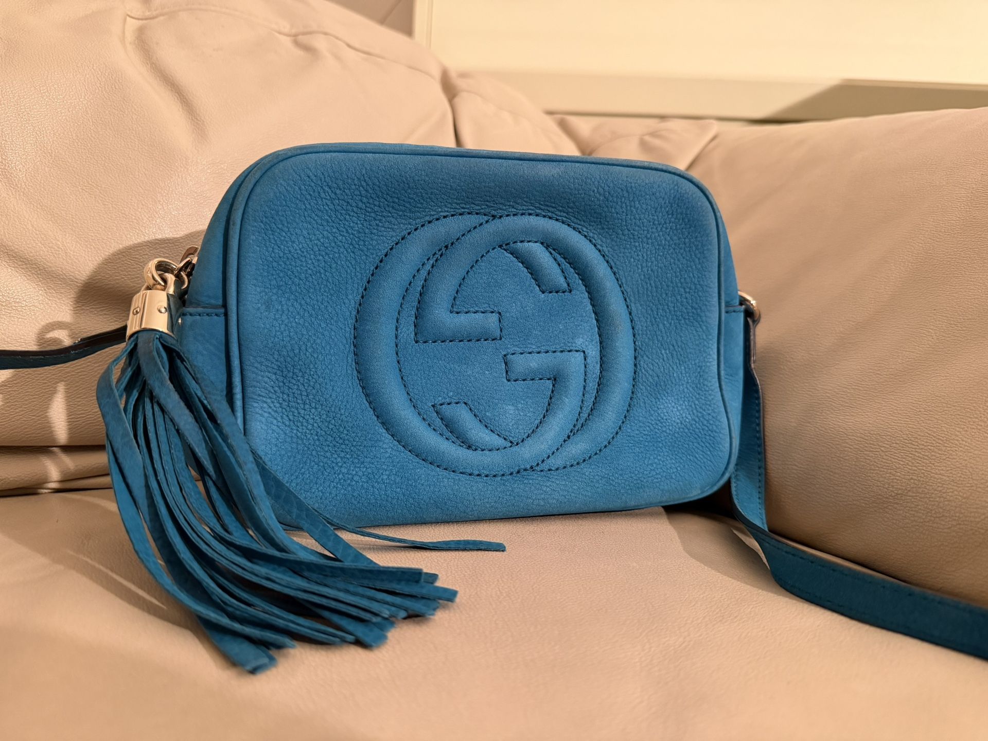 Authentic Gucci Soho Disco Crossbody Bag purse in turquoise blue suede-like leather Top zip closure Tassel zipper pull Two inside slip pockets SIZE Adjustable shoulder strap, 23" drop 10"W x 6"H x 3"D