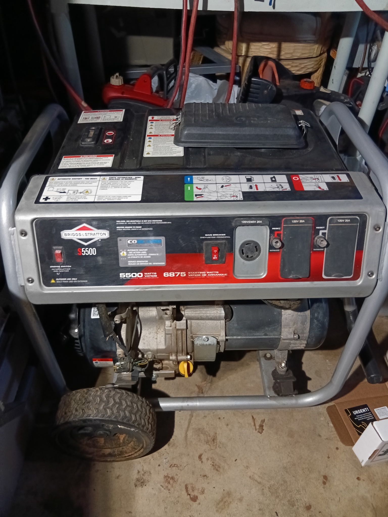 Briggs & Stratton 5500 watt portable generator. It has 5500 running watts and 6875 starting watts. The generator features a 389cc Briggs & Stratton OHV engine. It includes CO Guard carbon monoxide shutdown technology for safety. The generator has four 120V GFCI outlets and one 120V/240V 30AMP locking outlet. It has a 7-gallon fuel capacity and can run for 12.5 hours.