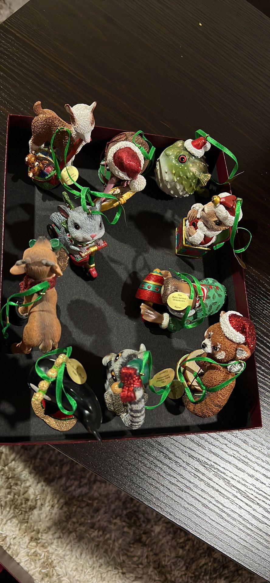 I am selling these wonderful amazing Danbury Mint Baby Animal Christmas Ornaments collection. You can either buy one or buy the entire set of 10. In this collection you will get the following: 1. Puffer Fish (individual price is $25.99) 2. Reindeer (individual price is $25.99) 3. Orca (individual price is $25.99) 4. Alpaca (individual price is $25.99) 5. Chinchilla (individual price is $25.99) 6. Lemur (individual price is $25.99) 7. Red Panda (individual price is $25.99) 8. Walrus (individual price is $25.99) 9. Prairie Dog (individual price is $25.99) 10. American Wood-pack (individual price is $25.99) You can buy individual ornaments or buy the entire collection for $200. For individual ornaments sale please message me and I can sell you that particular ornament. The current mentioned price is $200 that is for the entire set. I am located in Riverside. DM me if you are interested and I can either meet you somewhere close. The price is firm as it’s brand new with the original packaging. These ornaments are brand new with tags and box and never have been used. See less