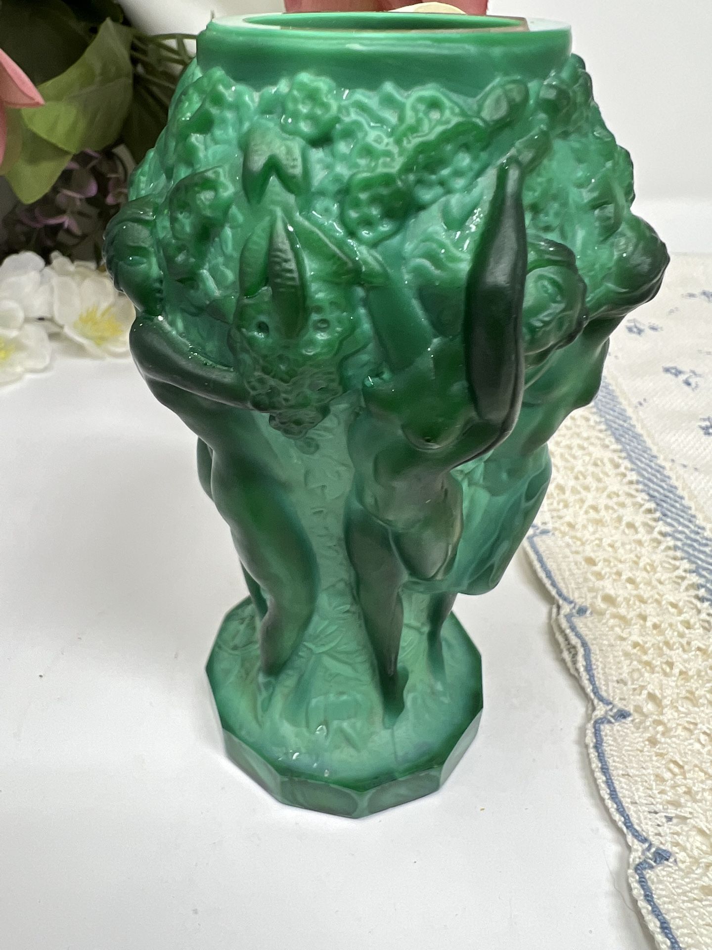 Designer: František Pazourek Beautiful original 1930s Art Deco malachite glass vase from Czechoslovakia, part of the collectible “INGRID” collection. This striking piece features elegantly molded nude figures and floral details, showcasing the exceptional craftsmanship of the Art Deco era. ✨ Details: • Origin: Czechoslovakia • Era: circa 1930s • Material: Malachite glass • Height: approx. 5 inches • Condition: Very nice vintage condition • No cracks or damage (see photos) The rich green malachite coloring and sculptural design make this vase a highly collectible Art Deco piece and a beautiful addition to any vintage glass or decorative art collection.