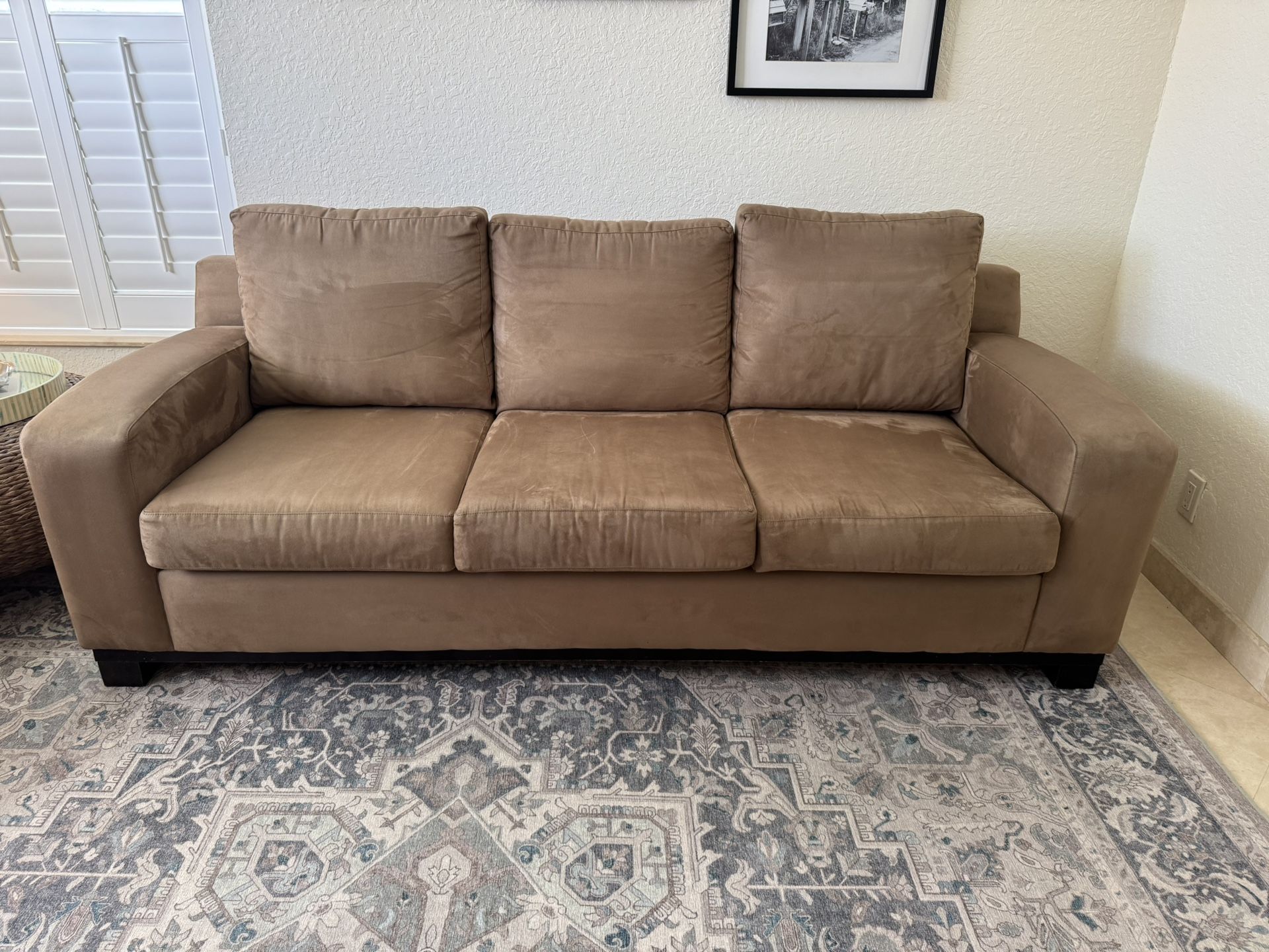 Comfy microfiber couch. There is a small tear in the seam on the back corner (pictured).