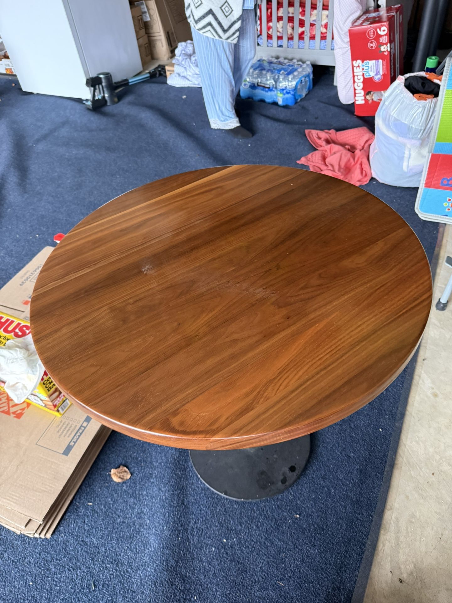 Title: Round Wooden Table Description: Solid wood round table in good condition. Sturdy and perfect for dining or kitchen. Pet free and smoke free home. – Pickup only