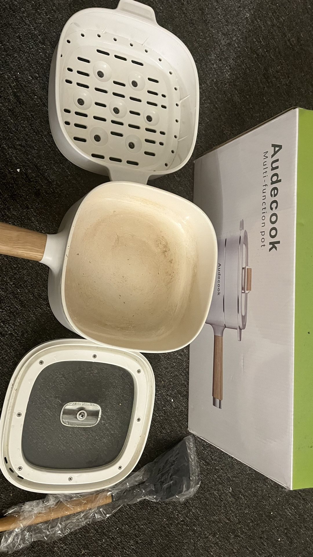 Easy for use and easy for cleaning, it can steam with the steam basket and include a brand new spatula. Those marks are heat marks from normal use, not stains or burns.