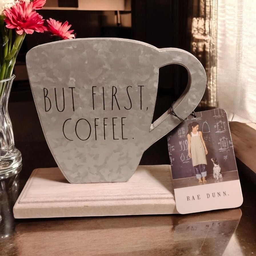 Rae Dunn metal cup-shaped tabletop sign. Features tall, black lettering that reads "BUT FIRST, COFFEE." Sits on a simple wooden base for display. Rustic farmhouse accent for kitchens and coffee corners. Measures 5 3/4" high and 6" wide. Brand New with Tags Never Used!