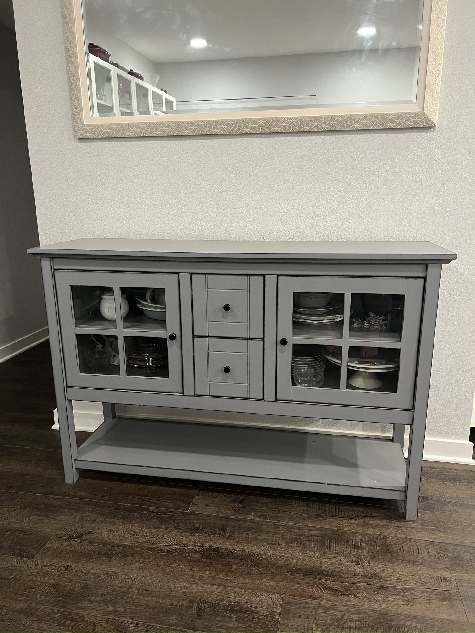 Pick up in Rancho Santa Margarita Cash Only Beautiful gray sideboard/buffet cabinet in excellent condition. Perfect for dining rooms, entryways, or living spaces. Features: • Two glass-door cabinets with interior shelves • Two central drawers for extra storage • Bottom open shelf for display or baskets • Smooth painted finish in modern gray • Sturdy wood construction Dimensions: • Width: 53 inches • Depth: 16 inches • Height: 35 inches The cabinet is solid and clean. Dishes and decor items shown in photos are not included.