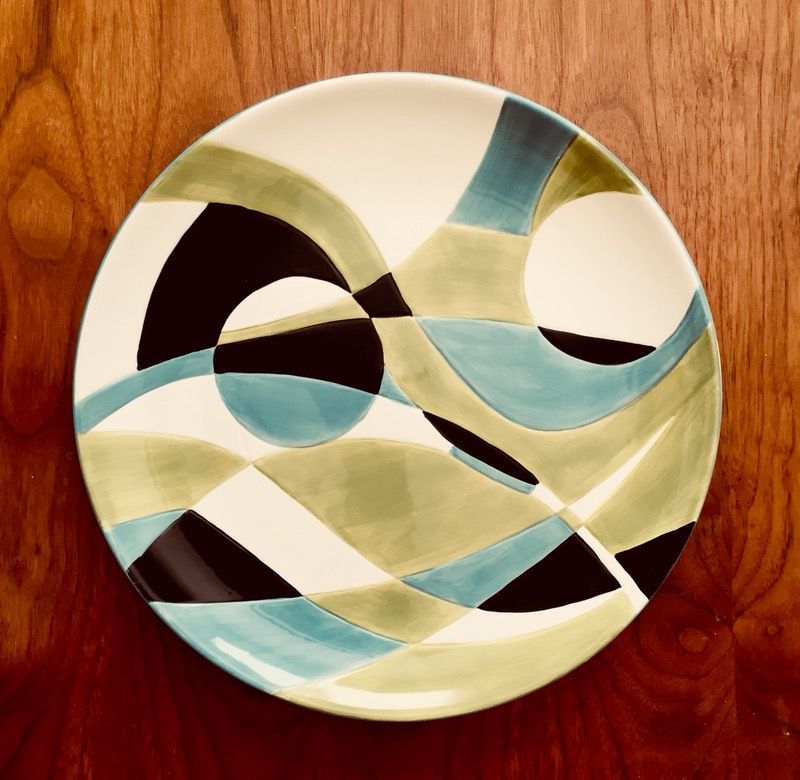Modern abstract geometric print “Folly” made for Pier One. Discontinued pattern. 13” diameter.