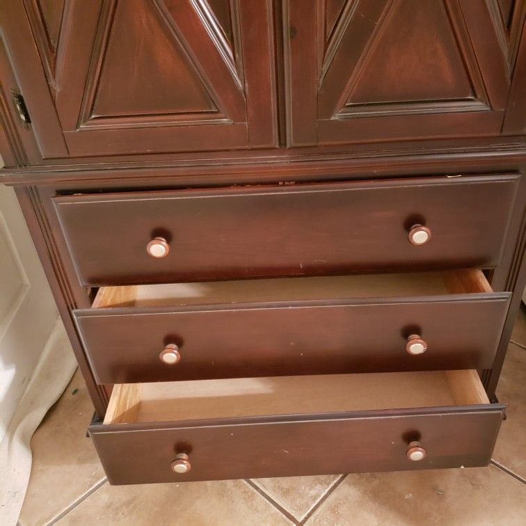 Large cabinet space with shelve and three spacious drawers. Minor scratches as shown in pix. 60 inches tall x 38 inches wide x 21 inches deep.