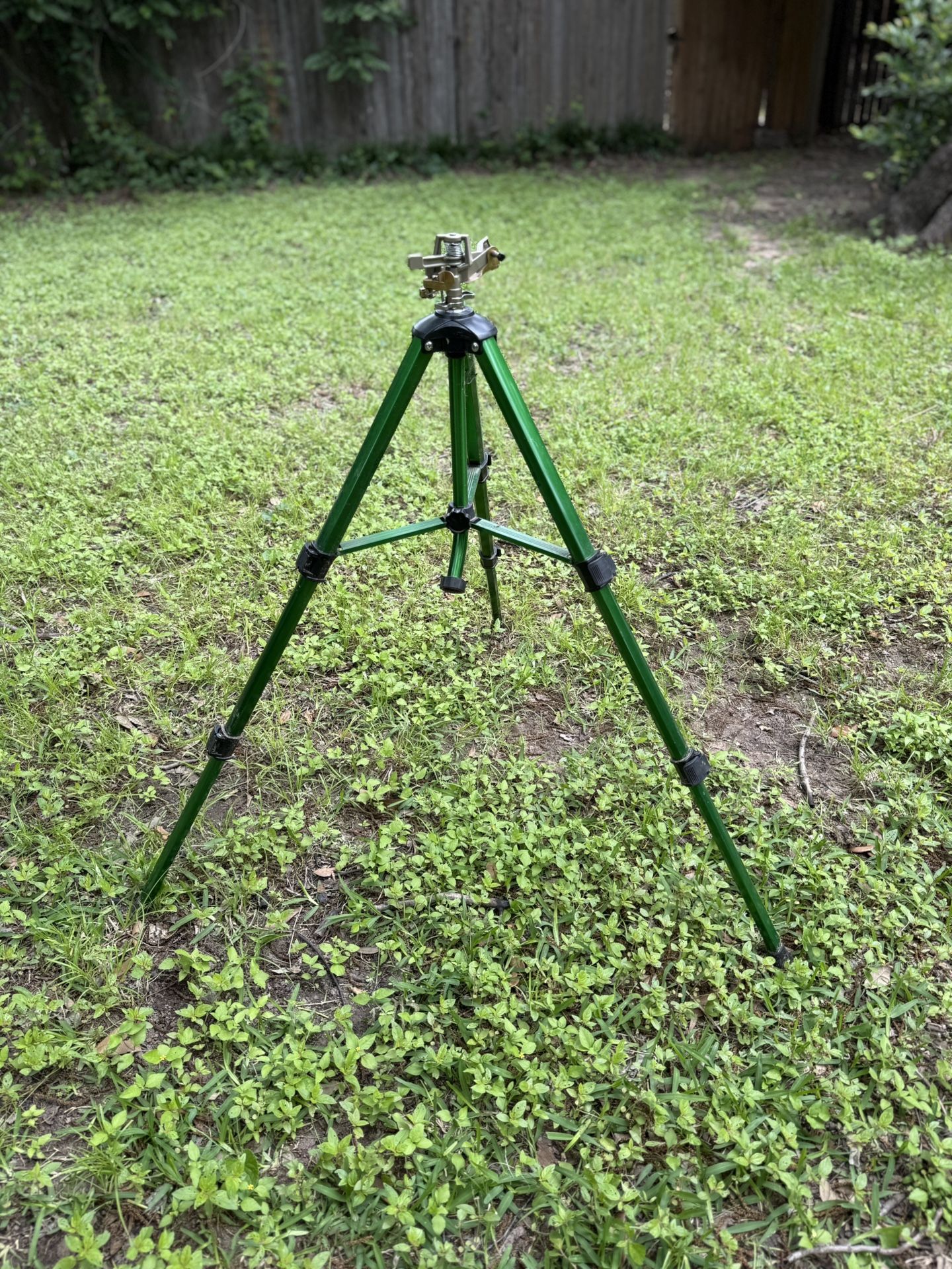 Yard sprinkler with adjustable legs and adjustable sprinkler head. Max reach is 30 ft. Used in good condition. Must pick up.