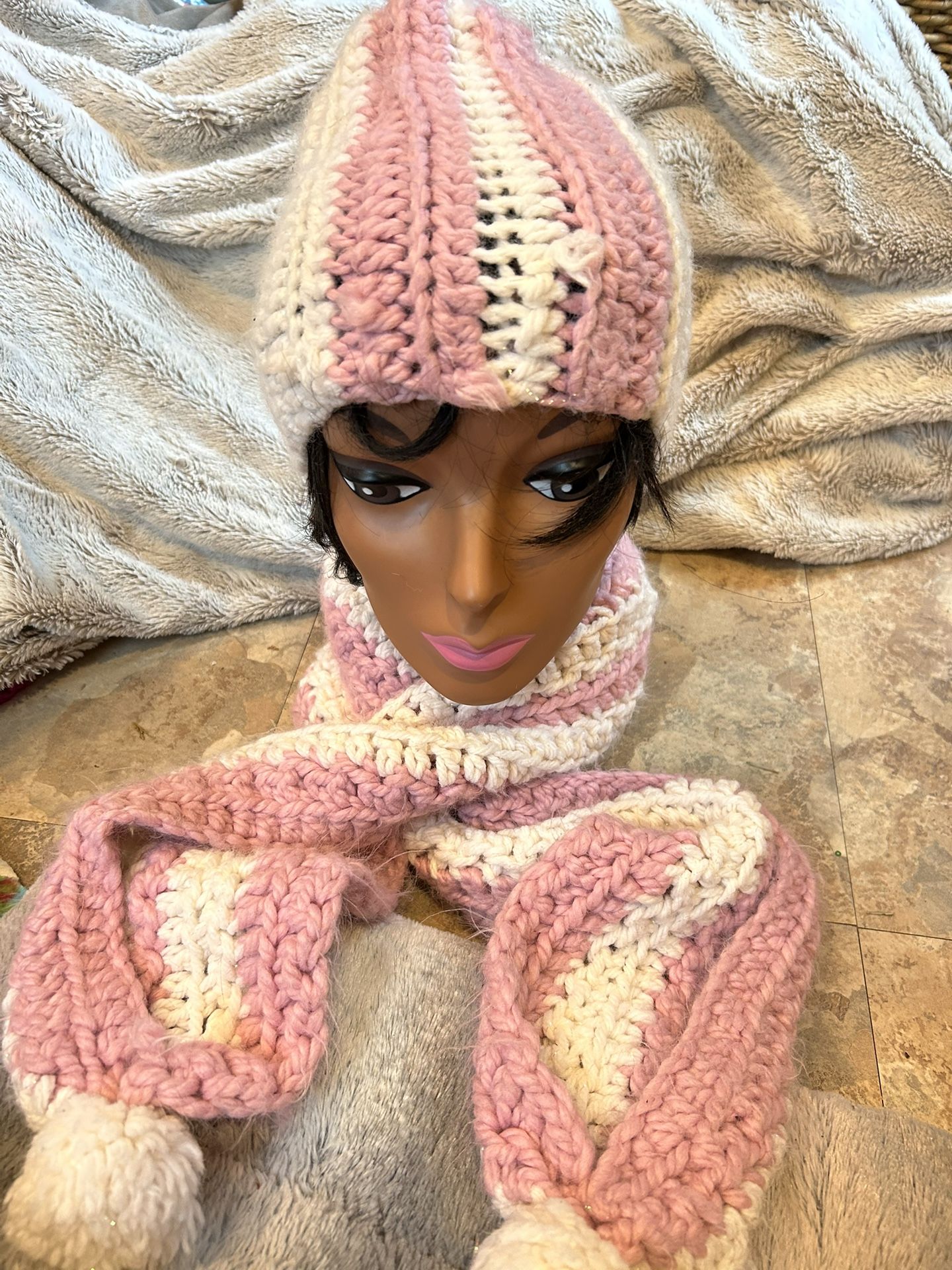 Hat & Scarf Combo Matching Set Pink White Sparkly Handmade Hat OSFA Scarf 60” long 8” wide