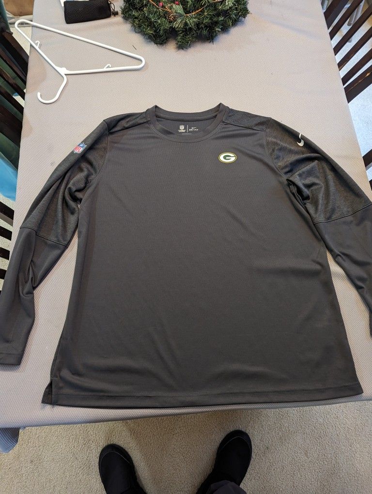 Nike Green Bay Packers long sleeve Dri-FIT crew neck shirt in grey. Official NFL On-Field apparel. Size: Tagged XXL, but fits like a Men’s XL. Condition: Great condition — no stains, holes, or issues. Clean and well cared for. Details: Nike Dri-FIT moisture-wicking fabric Long sleeve crew neck Green Bay Packers team graphics Official NFL On-Field apparel Lightweight and comfortable for workouts, game day, or casual wear Perfect for Packers fans, training, or everyday use. Smoke-free home. Feel free to message with any questions.