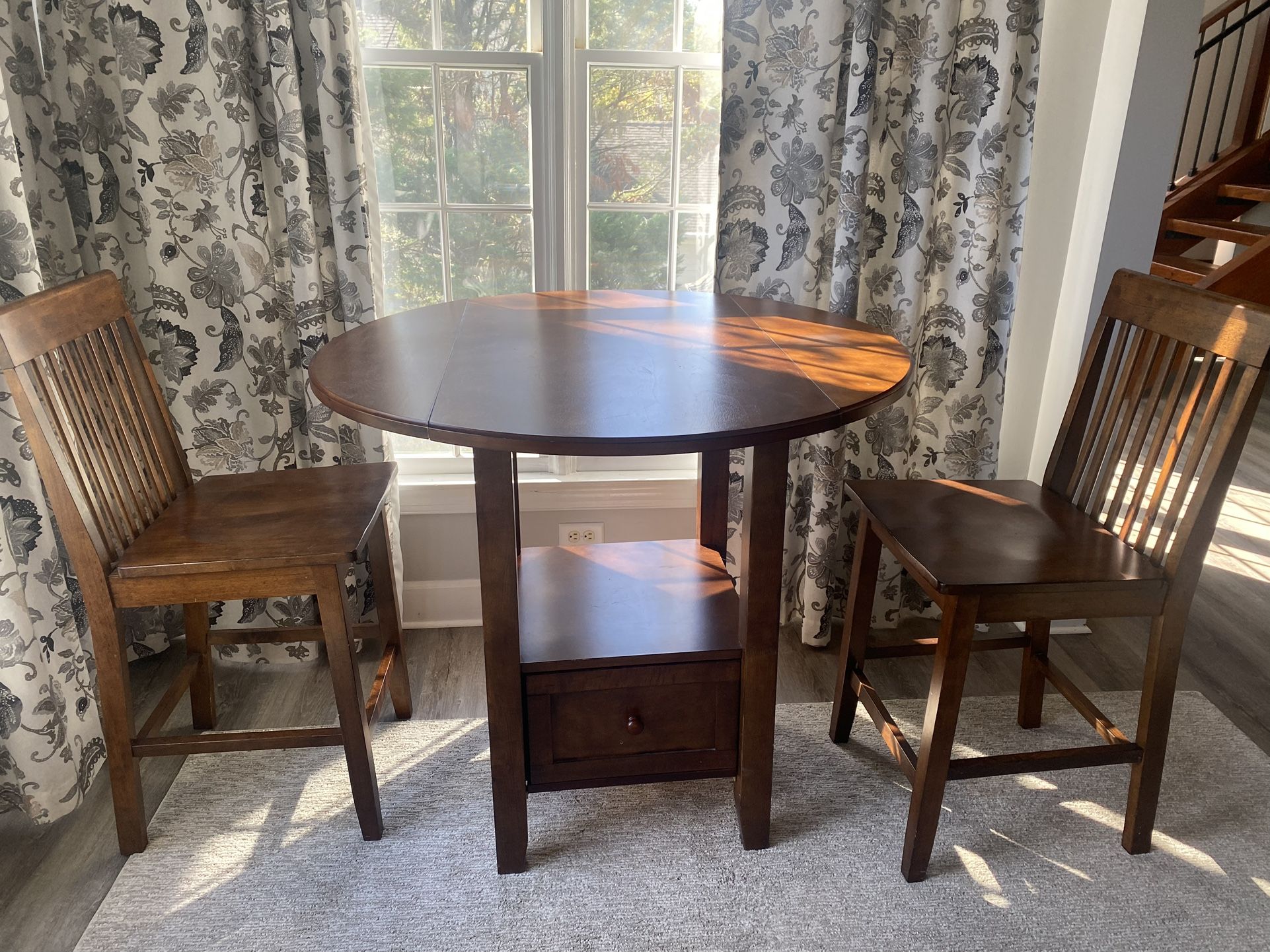 Bistro table in like new condition. Dimensions are 40” round 36” high. It has two drop leafs. There is a storage drawer at the bottom. Complete with two chairs. $150. Local pickup, possible delivery for a fee.
