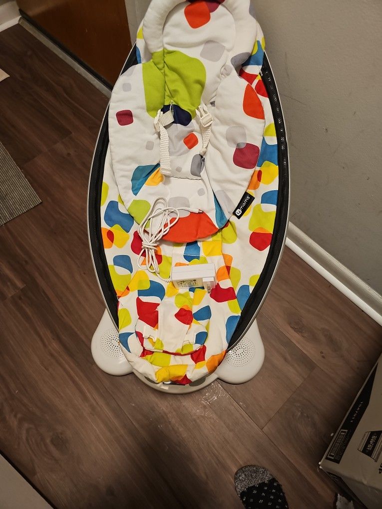 The item in the image is a 4moms MamaRoo Multi-Motion Baby Swing. This infant seat is designed to soothe babies by mimicking the natural movements of parents.