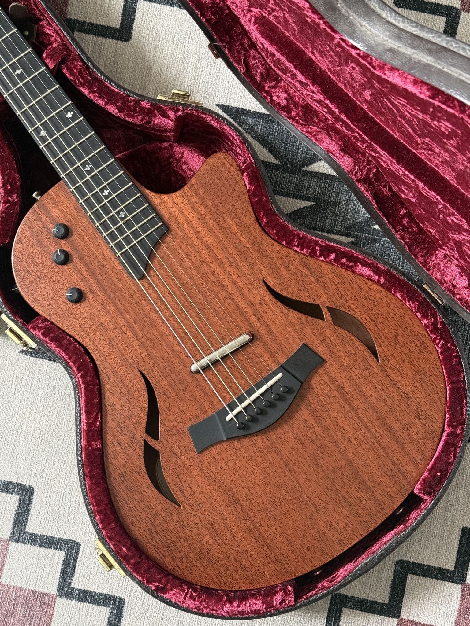 Versatile hybrid hollowbody electric/acoustic guitar that seamlessly blends electric playability with acoustic warmth. Features Taylor's innovative three-pickup system (two humbuckers + acoustic body sensor) with 5-way switching for incredible tonal range—from warm acoustic strumming to electric leads with the flick of a switch. Specs: * Neo-Tropical Mahogany top & neck * West African Ebony fretboard with jumbo frets * 24-7/8" scale length, 12" radius * Venetian cutaway * Serial #110(contact info removed) Condition: Good - minimal fret wear, no major scratches or dents. Well-maintained and ready to play. Perfect for players seeking one guitar that genuinely covers both acoustic and electric territory. Ideal for studio, stage, or home recording.