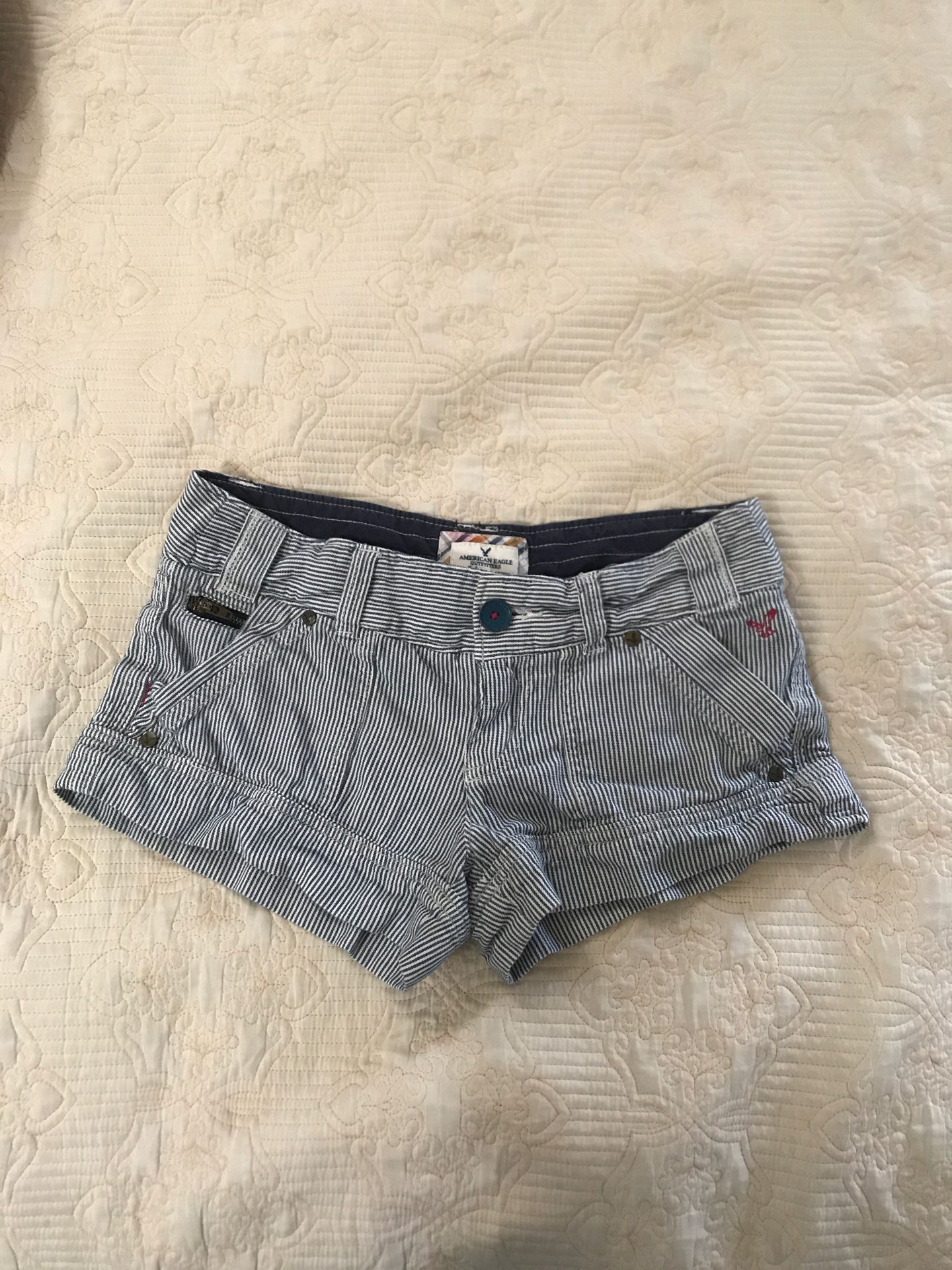Brand: American Eagle Outfitters Color: dark blue jean & white stripes Size: 2 Style: short shorts, low rise Missing inside button see in photo Measurements in pictures In good condition no stains or holes Any questions just ask