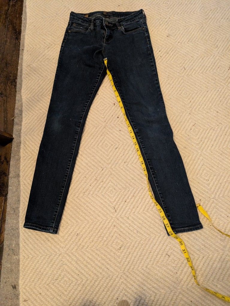 KUT from the Kloth Skinny Jeans - Dark Wash Product Highlights Brand: KUT from the Kloth. Fit: Skinny / Slim leg silhouette. Wash: Dark indigo with classic orange contrast stitching. Fabric: High-stretch blend (Cotton/Polyester/Spandex) for comfort and shape retention. Condition: Excellent pre-owned condition. Measurements (Laying Flat) Waist: 14 inches (Total circumference approx. 28 inches). Rise: Mid-rise