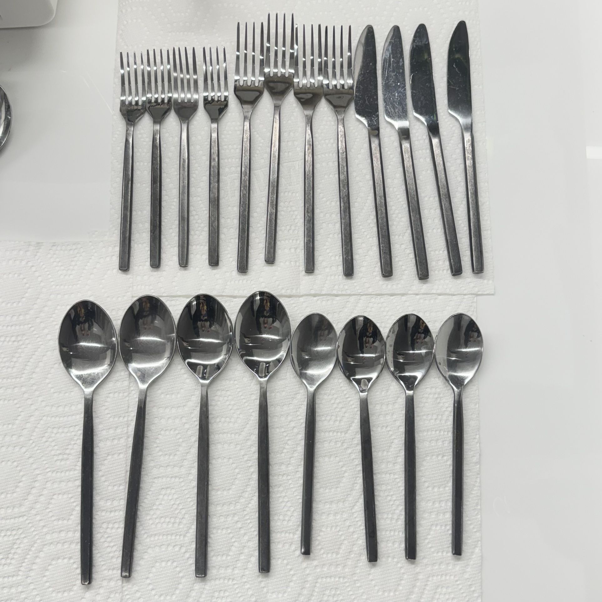 20 piece set includes 4 salad forks, 4 dinner forks, 4 soup spoons, 4 dinner spoons, 4 knives all accounted for. Pick up in 90046. First come first serve. If the listing doesn’t say sold then it’s still available.