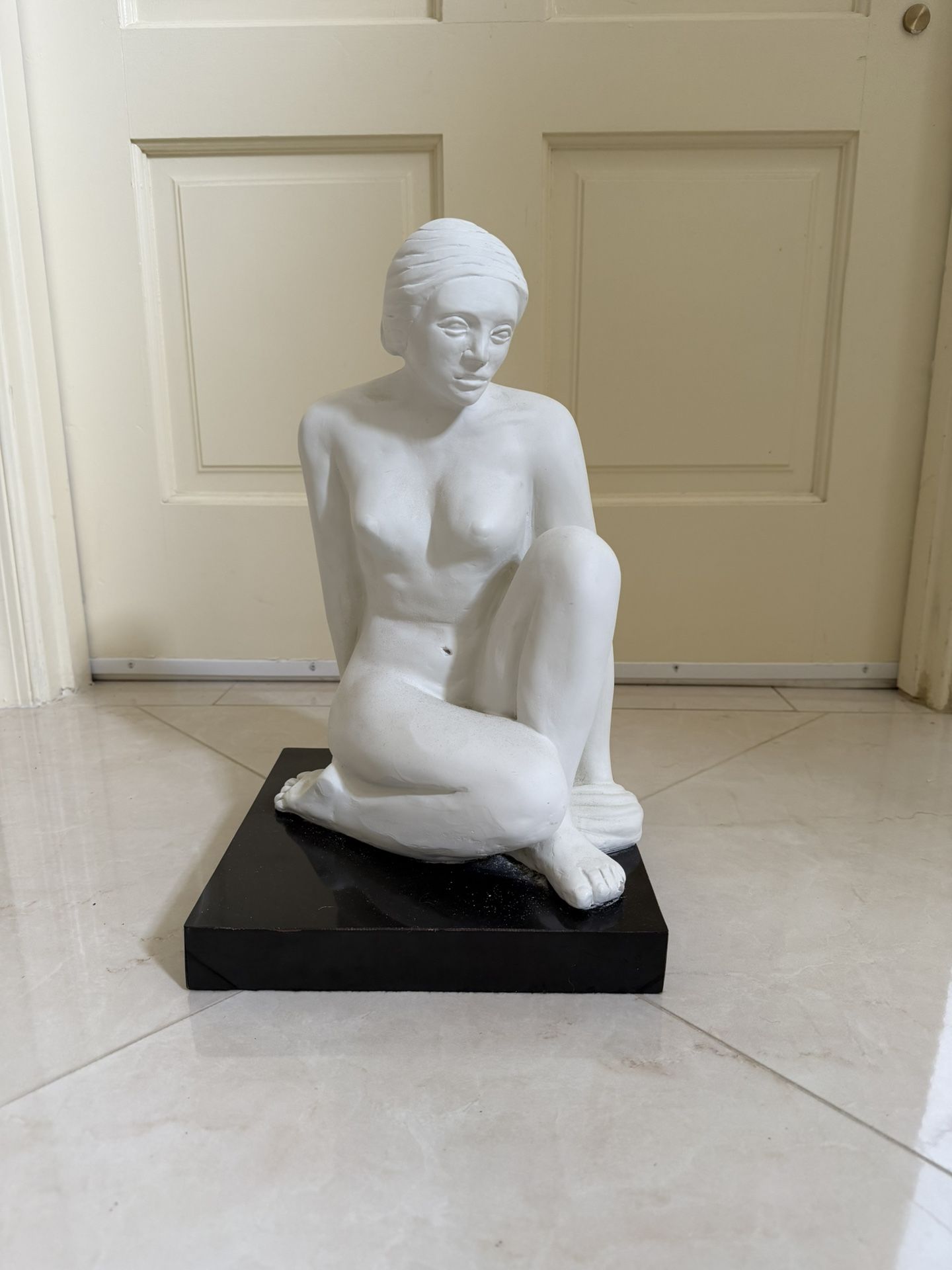 Striking classical sculpture depicting Aphrodite, the Greek goddess of love and beauty, shown in a serene seated pose inspired by ancient Greco-Roman art. Finished in a smooth white stone-like tone and mounted on a contrasting black base, this piece has a timeless, museum-style presence. The sculptural detail and balanced proportions make it an elegant accent for any space - perfect for a living room, study, entryway, or art-focused interior. Aphrodite’s relaxed posture and contemplative expression give the piece a calm, refined energy that works beautifully in both traditional and modern settings. Dimensions: 10” (L) x 10” (W) x 16” (H)