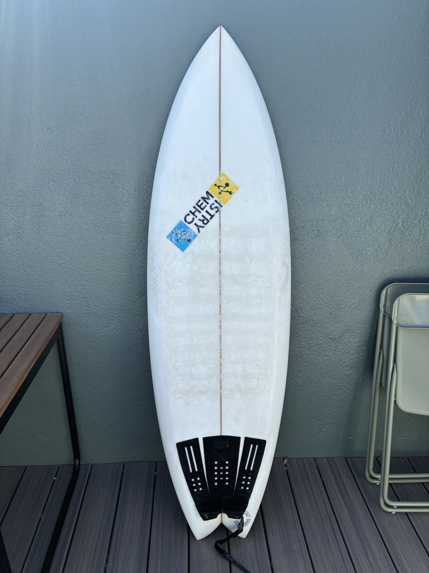 Chemistry Hybrid Surfboard Perfect for 3 to 6ft waves 5’10 x 205/8 x x 29/16 - 37L Swallow tail - Thruster or Twin set up Flat deck good volume easy paddler Glide like a fish Ride like a short board Swallow tail - Thruster or Twin set up Very reactive - Glide good - can handle drop and steeper wave Offer accepted - Fins +$50 Perfect condition other than regular foot pressure Offer accepted- Fins +80