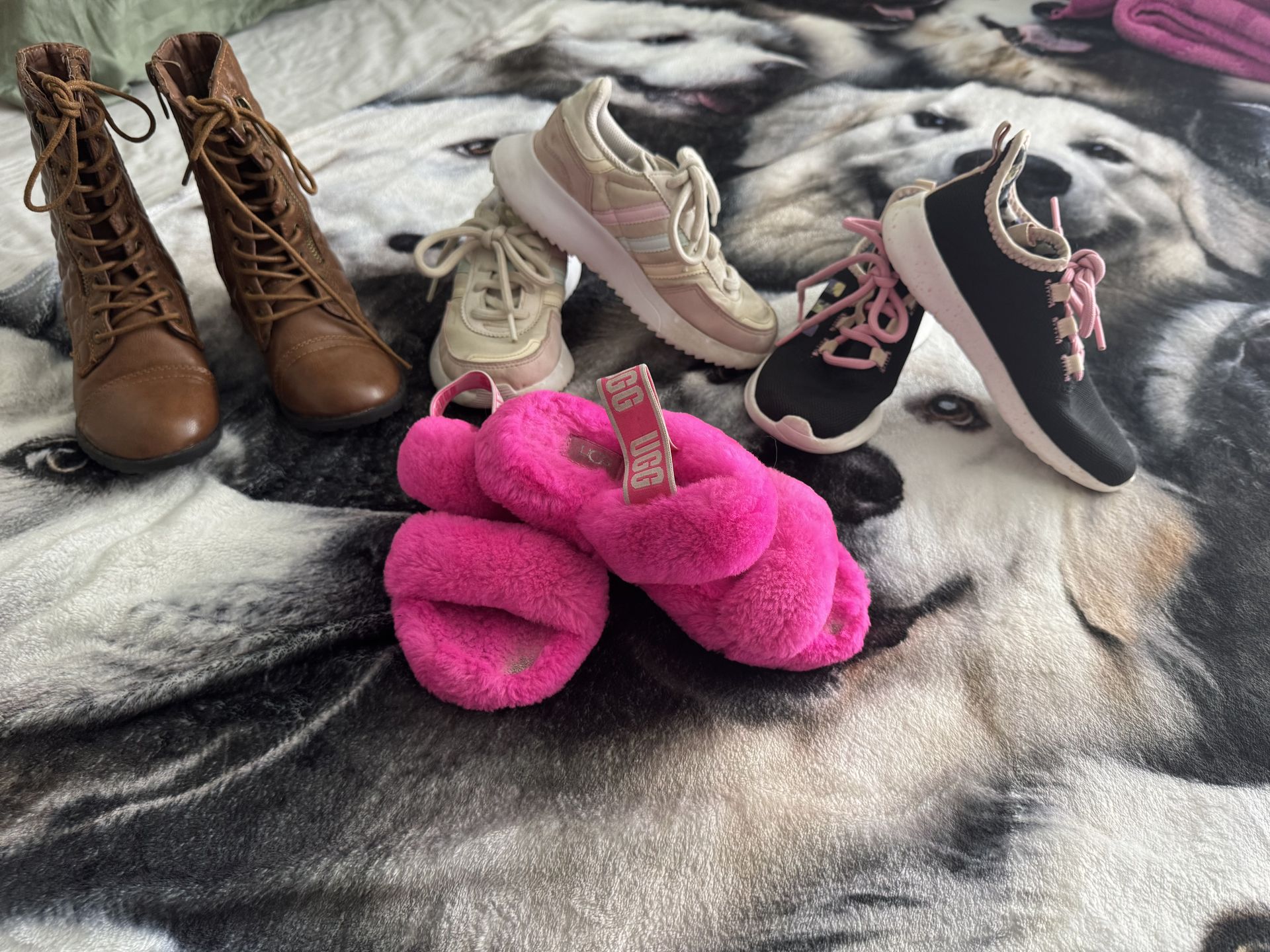 Used good condition Black adidas size 1 Pink and white adidas size 1 Brow boots size 1 Pink Ugg size 13