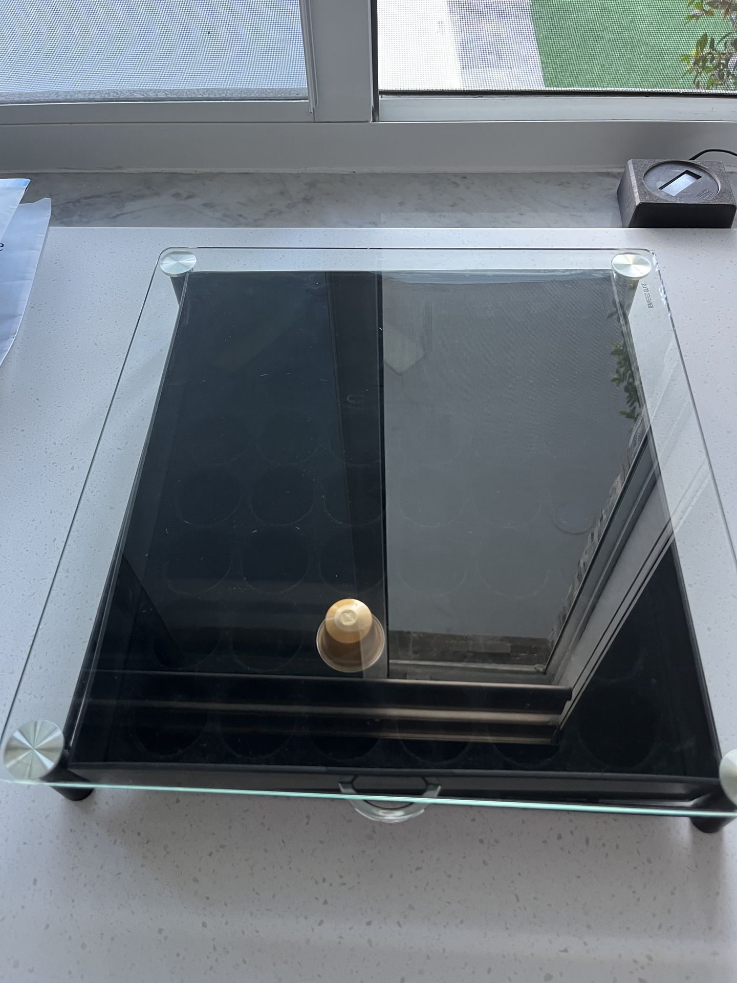 Tempered Glass Coffee Pod Drawer for Nespresso Original Line. It can hold up to 42 Capsules. Since I sold my Nespresso machine I don’t need it anymore. It’s in decent condition.