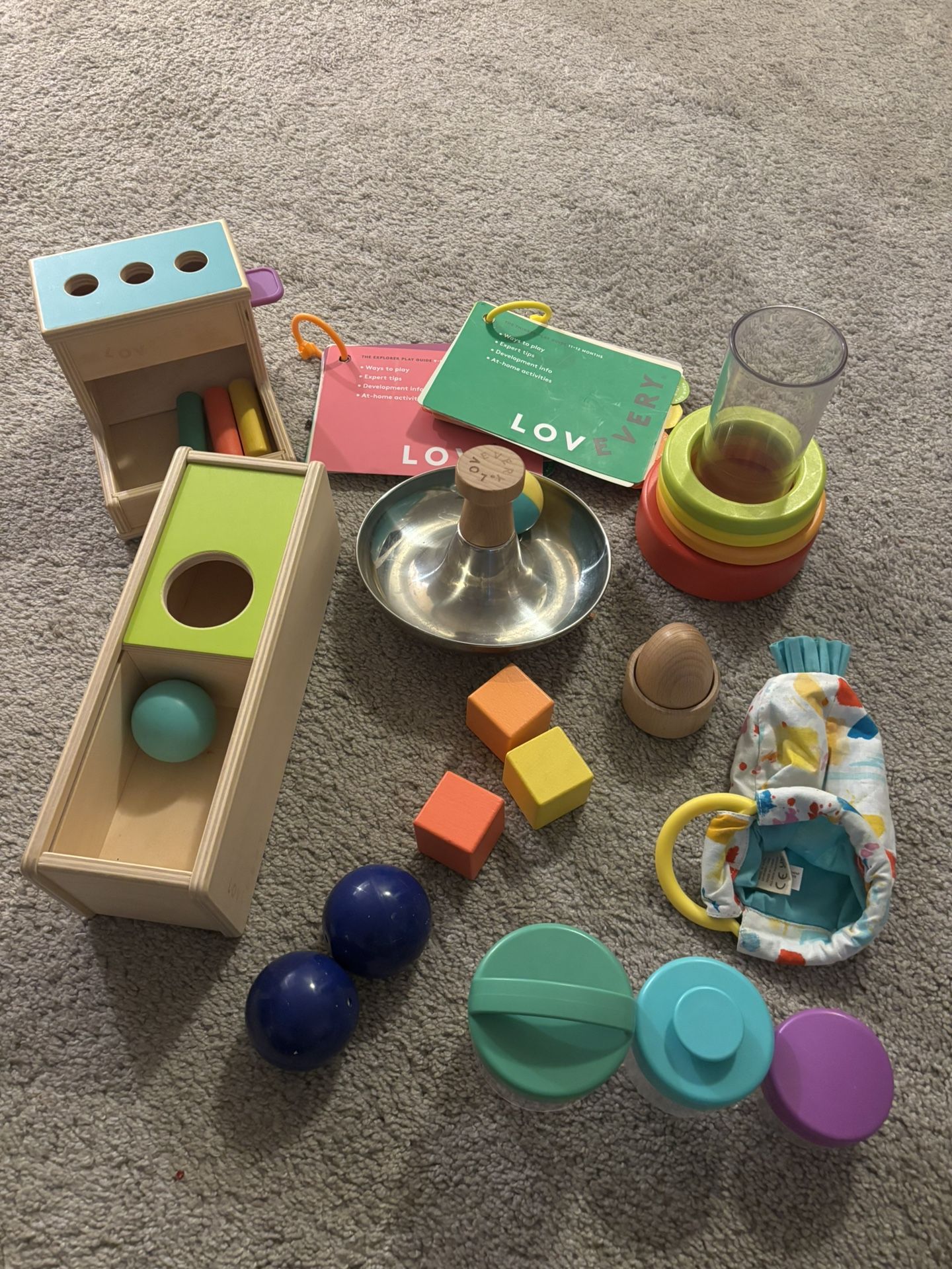 Items from the explorer kit (9-10months): first blocks, clear tube with stacking rings, egg cup, 3 canister set, stainless steel tip and turn with ball, scarf (not pictured) Items from the thinker kit (11-12 months): opposite balls, sensory pouch, sliding top box, pincer puzzle (not pictured), wooden peg drop Will sell individually just make me an offer. Or altogether for $50