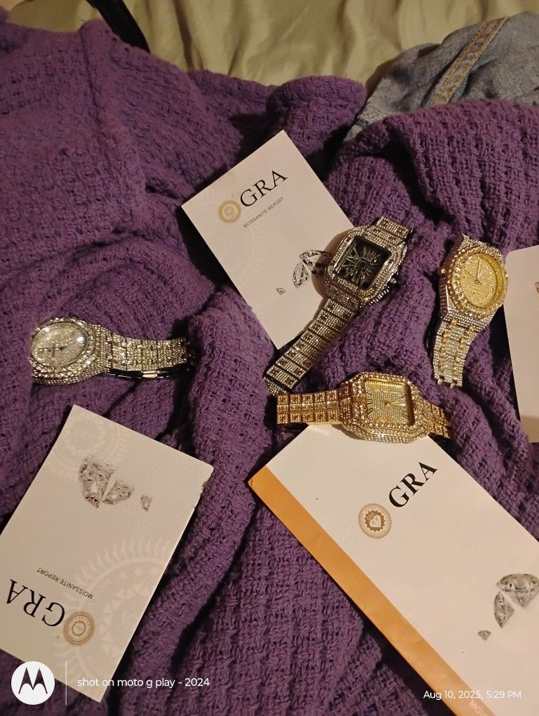 I have four moissanite diamonds watch two of them are 27 carats one of them are 32 carat one is 15 carats I'm looking to sell all four of them for around 1800 or best offer if you would like to get different watches I have a supplier that makes me pay 10% up front until watches get delivered and then I have to pay the rest each watch is 450 if you want automatic with box and paperwork if you don't mind box and paperwork I can get it around $300 a piece if you want the watches that is not automatic I can get them too them are $250 with paperwork $300 with paperwork and box and then if you don't want to paperwork or box they're around 180 for just a watch that is not automatic with full moissanite diamond watch so if you would like to get at me you can call me at 7tree,for 597 188three shipping on watches take roughly about 14 days business days if you would like to get them sooner I can get them within 9 days for an extra $50 shipping cost and it will be there within 9 days it usually comes within the first five