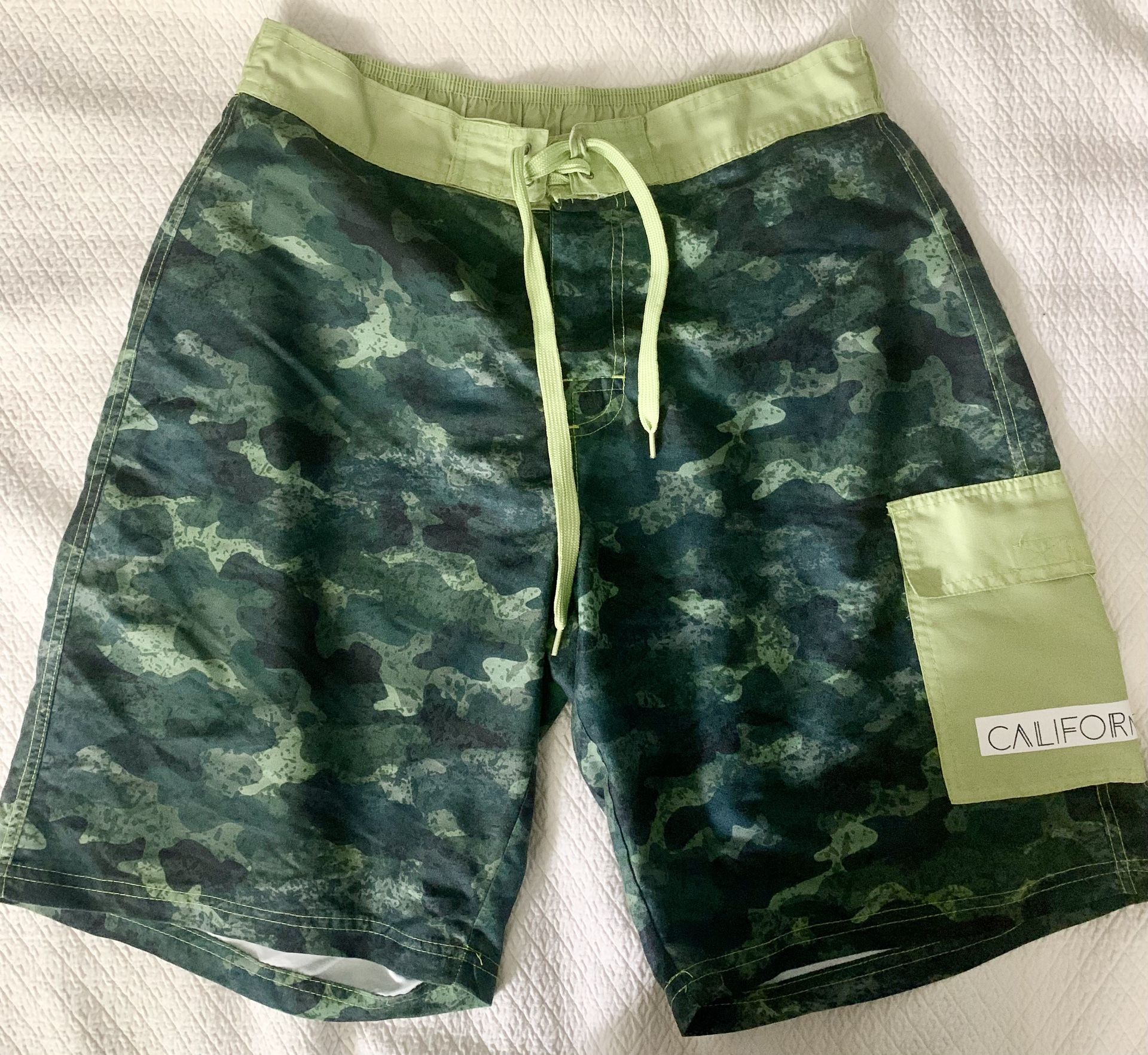 Men's Camo/California Swim Trunks (Lined) Size L The California is starting to peel off a little bit on the side other than that they're in Excellent Condition!!