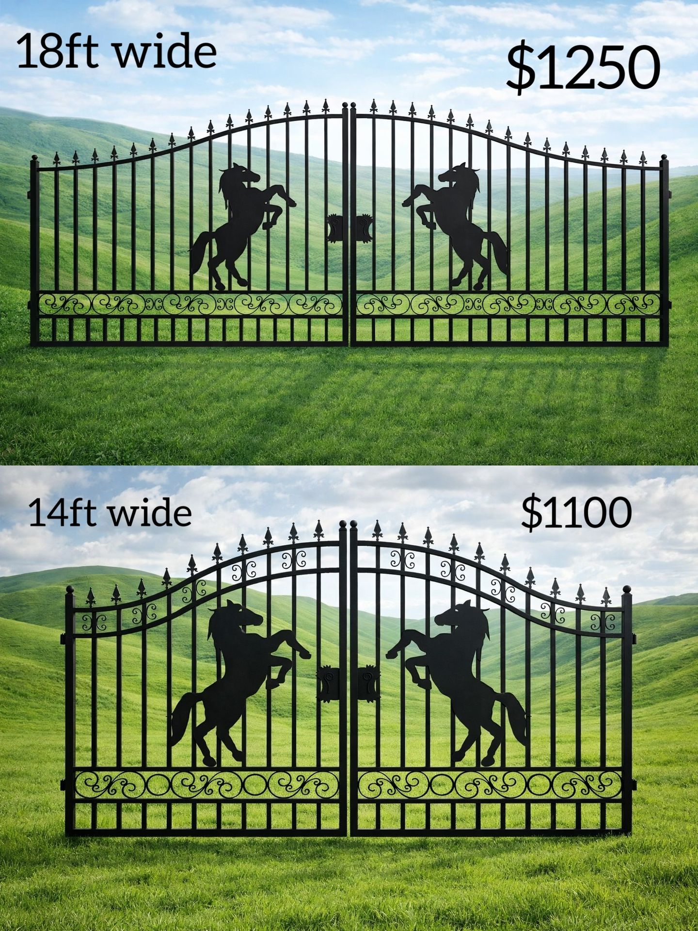 Black Metal Swing Gates – Heavy Duty, Powder Coated High-quality black metal swing gates available in 20 ft, 18 ft, and 14 ft widths. Multiple designs in stock. • Professionally welded • Powder-coated finish for long-term corrosion resistance • Equipped with heavy-duty hinges • Strong, clean, and well-balanced construction Posts are NOT included, but are available separately. Gate Post (sold separately): • Size: 5” x 5” • Length: 10 ft • Color: Black, powder coated • Price: $250 per post 🚚 Delivery available anywhere Message for designs, availability, or delivery quote.
