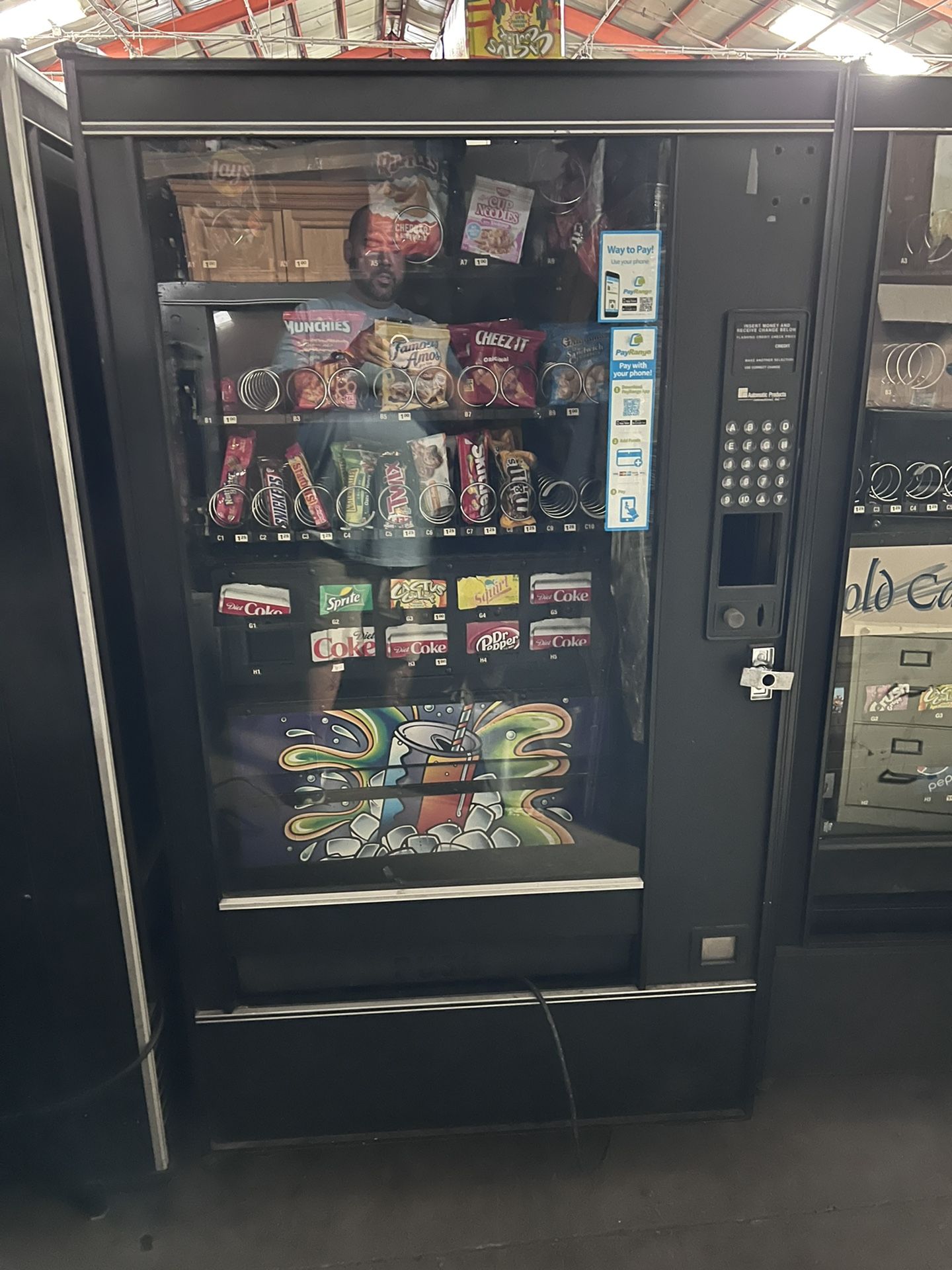 This machine has 10 selections of 12 oz soda. It’s an automatic products lcm4. 2 available. Takes $1 &. $5 bills. Credit card capable. Delivery available and it comes with 90day parts and labor warranty.