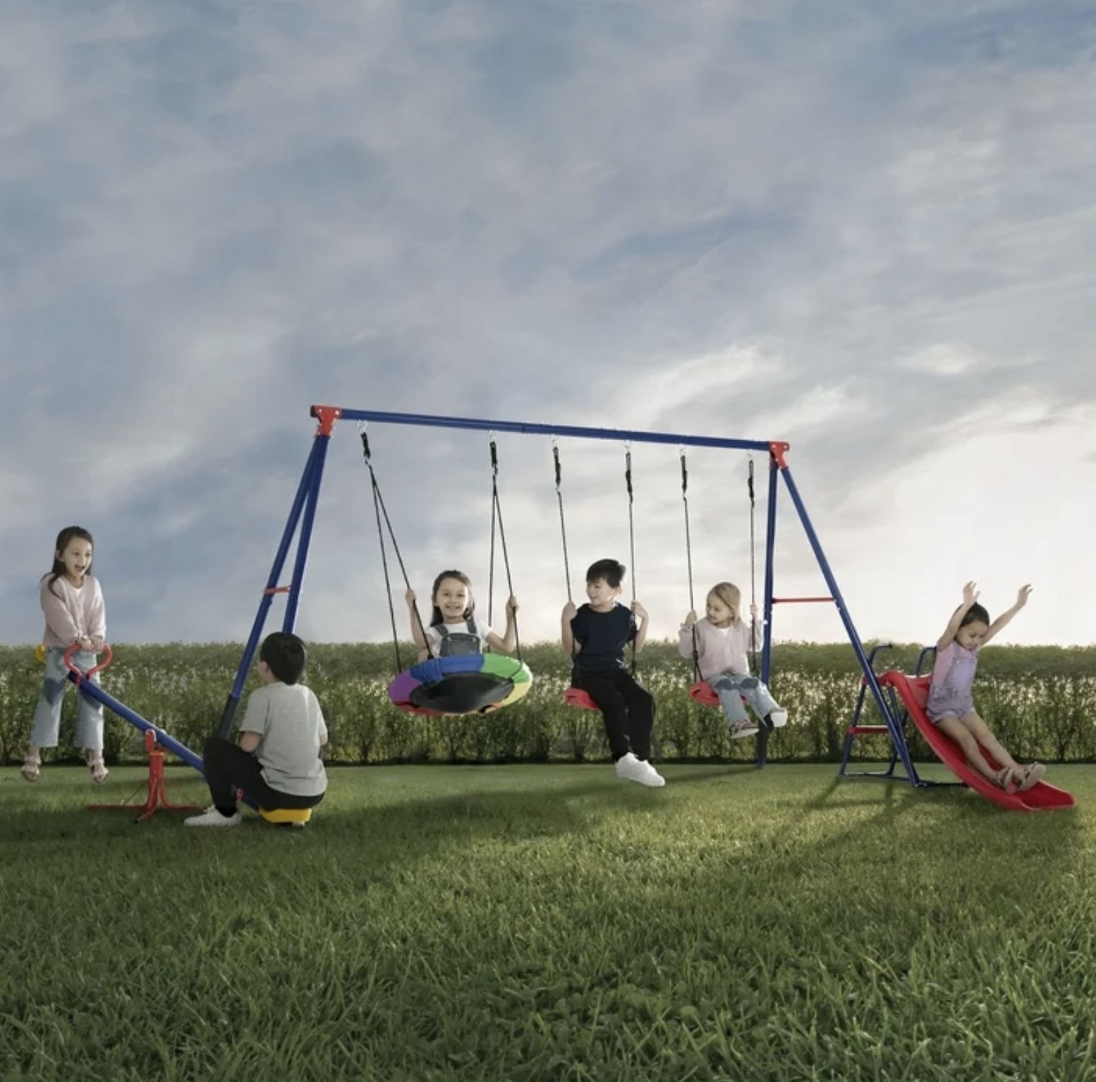 NEW Swing Set W/ 2 Swings, 1 Disc Saucer Swing, Slide & Seesaw Teeter Totter W/ 360-Degree Spin !