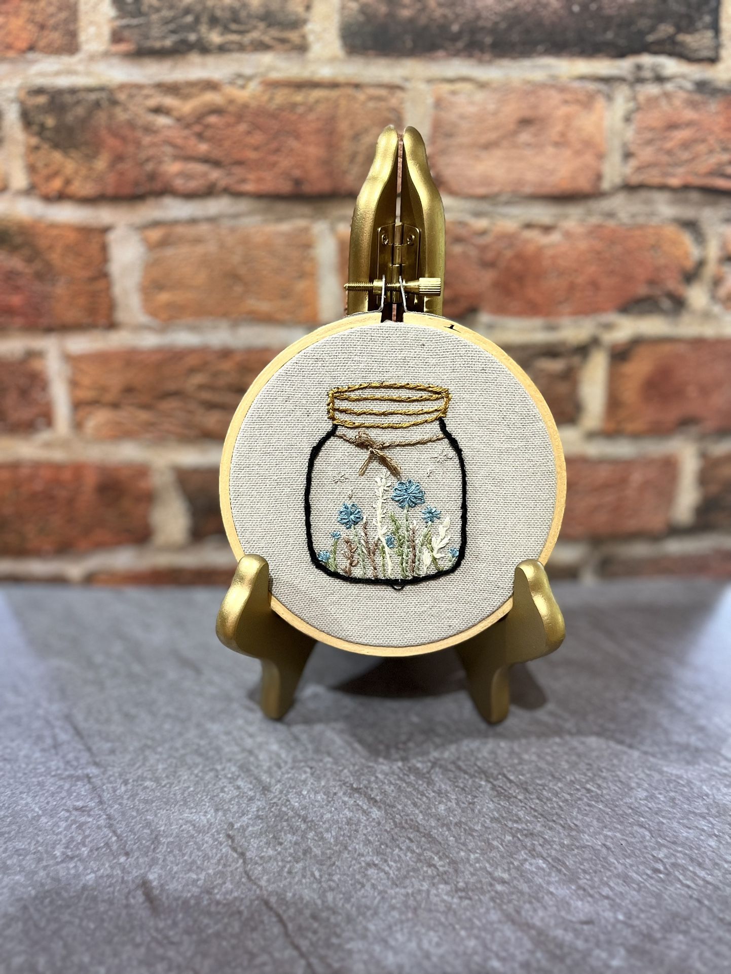 This is a hand embroidered piece that is set in a 4” round bamboo hoop. The picture is of a small dainty jar that has flowers and leaves inside it. I am offering shipping but I am also offering pick up in the local area. I also can do hand made to orders as well.