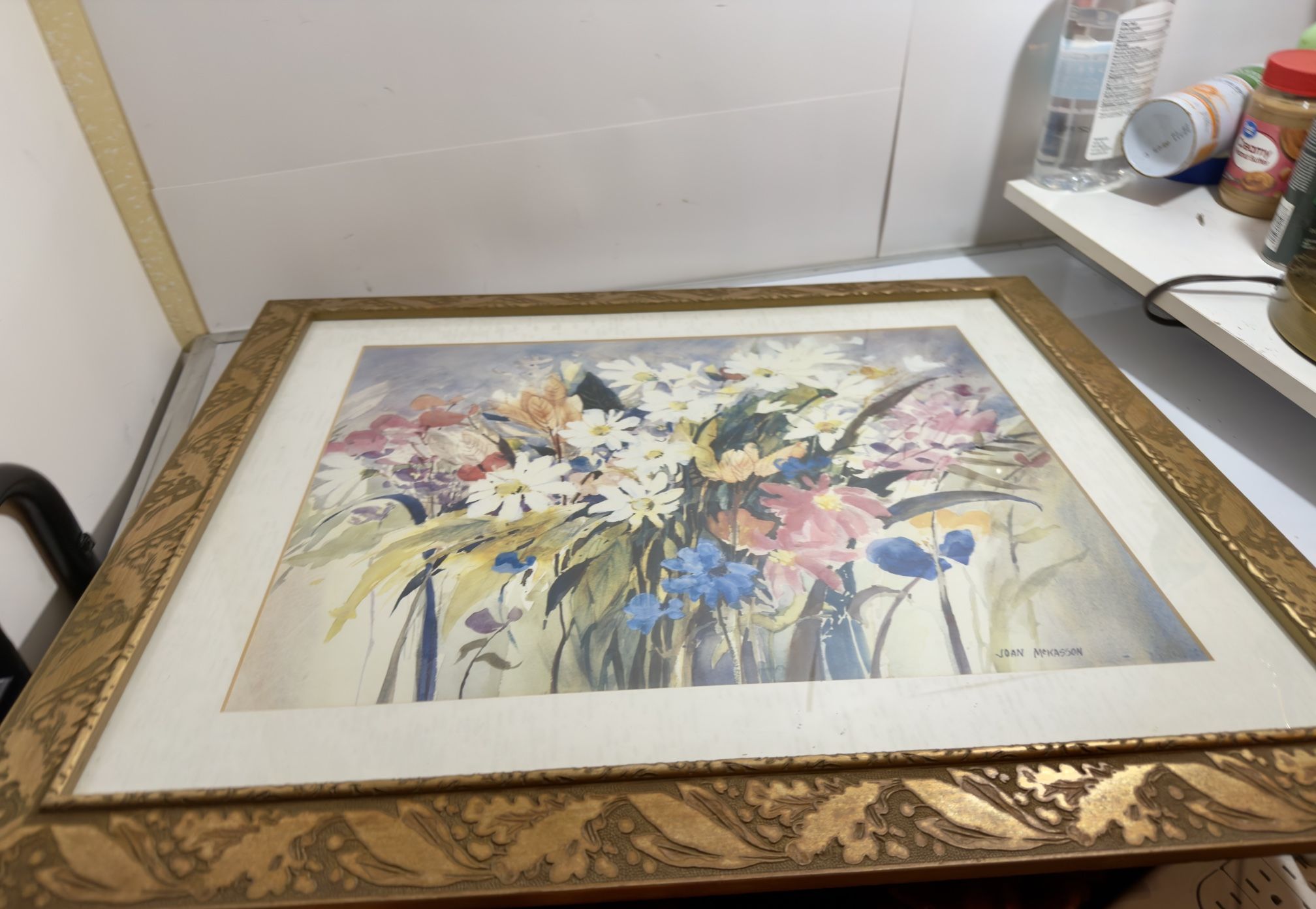 Beautiful framed floral wall art featuring a soft, impressionistic bouquet of daisies and pastel blooms in shades of white, pink, blue, and golden yellow. The brushwork gives it that light, airy, timeless feel that works in almost any space without overpowering it. Signed Jan Madsen in the lower corner, this piece is professionally matted and displayed in an ornate gold-tone frame with detailed decorative accents that add a subtle vintage elegance. The wide mat border enhances the artwork and gives it a polished, gallery-style presentation. Measurements: 24” x 28 Pick up on Thornhill near Floresta elementary