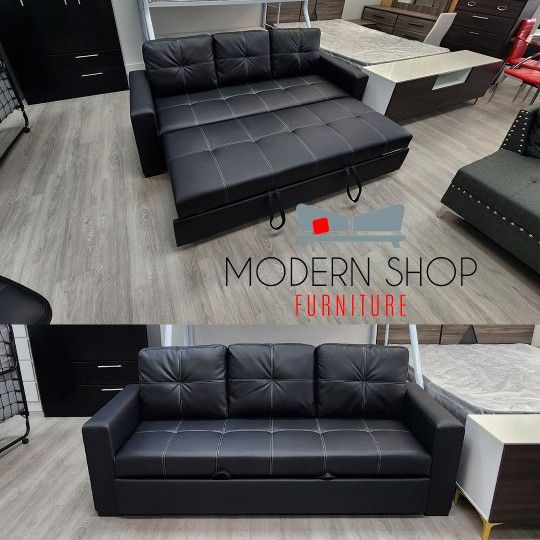 Convertible sofa ( sofa cama) Material: negro ( FAUX LEATHER) azul y gris: POLYFIBER Medidas: Sofa 85 x 32 x 33 Sofa w/pull out bed ( abierto) 85 x 58 x 33 Precio: $550 Precio de ensamblado :$30