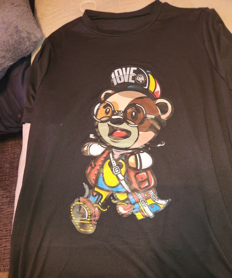 Black dress with colorful teddy logo. Size 4x . Feels like cotton, but its polyester & spandex & it stretches. Short sleeve & stops above the knees.