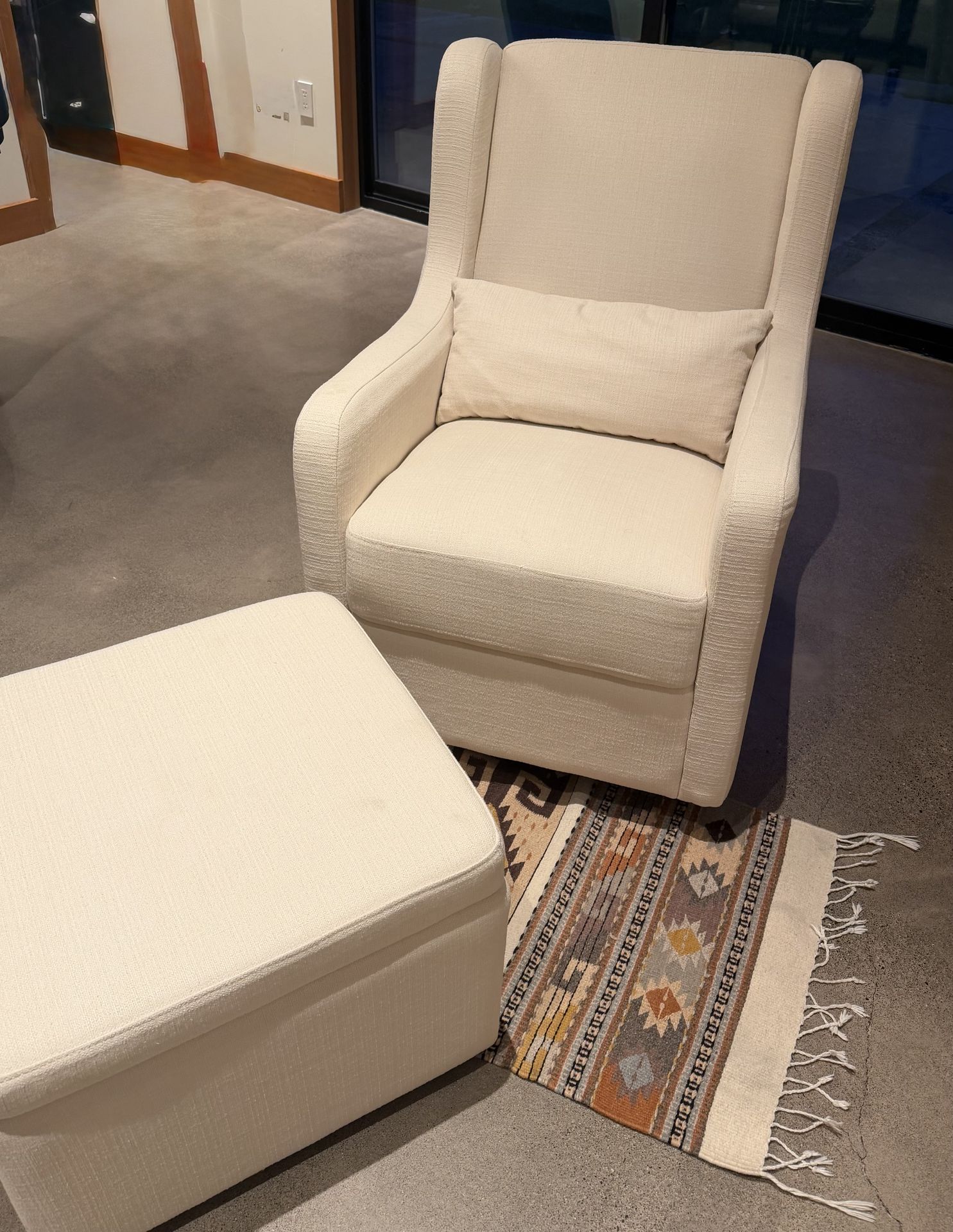 Glider in great condition. Two slight stains pictured (likely removable) on arm and ottoman. Dimensions in photos. Cash or Venmo. Product description from website: The Adrian glider with storage ottoman has been thoughtfully designed to make feeding time comfortable and easy. Mom can rest easy in this soft and durable glider that glides forward and backward and swivels 360 degrees. Its water repellent & stain-resistant fabric keeps the glider looking beautiful through years of use. With its clean lines and wingback style, this timeless and versatile design can easily transition to your home in later years.