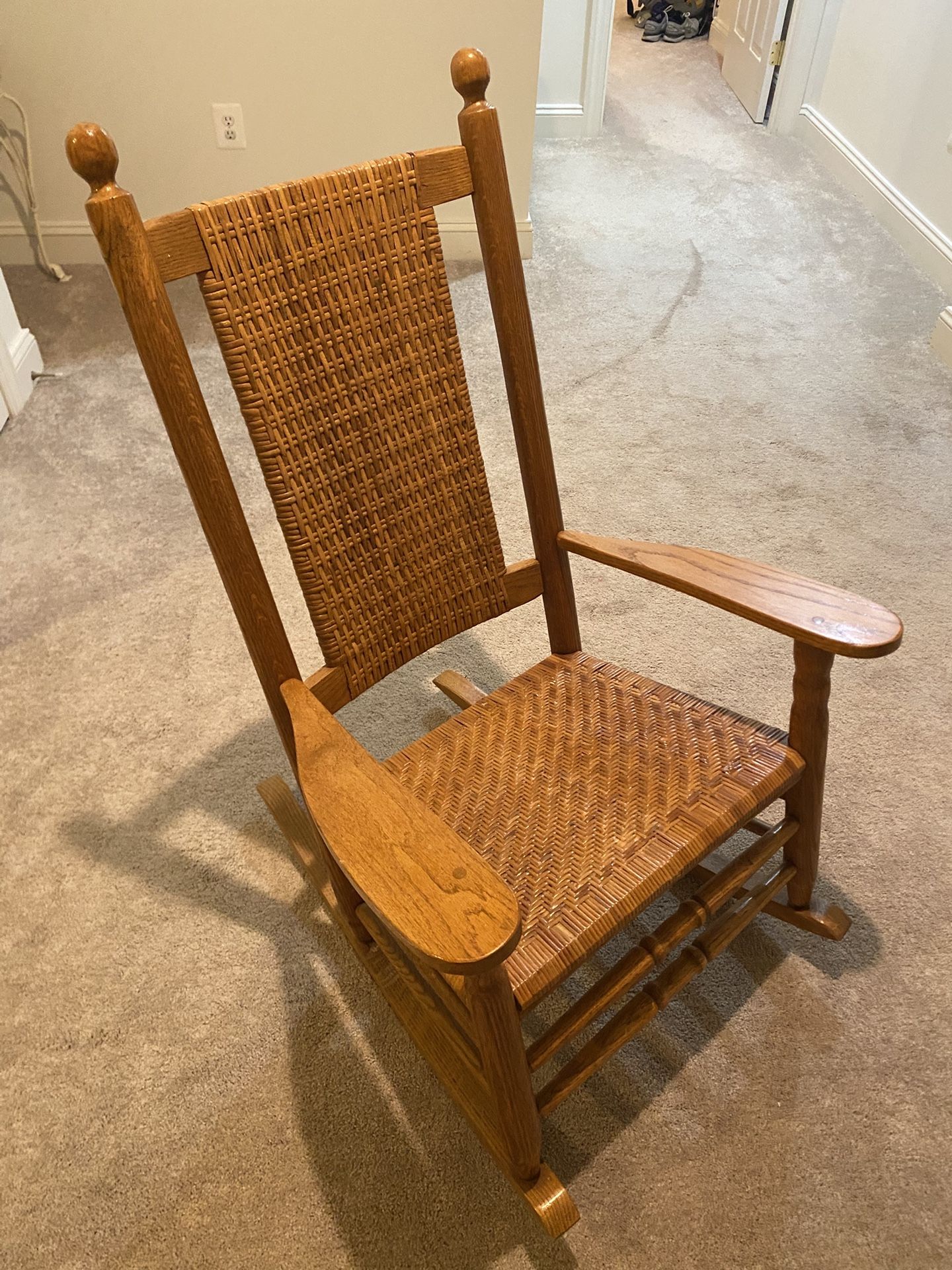 Beautiful oak rocking chair. Perfect for any room or a covered porch. Very well made in the USA