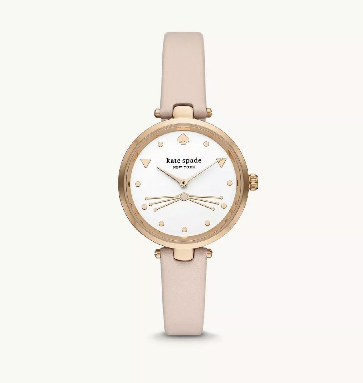 KATE SPADE NEW YORK HOLLAND PINK CAT WATCH, PALE PINK LEATHER BAND KSW9049