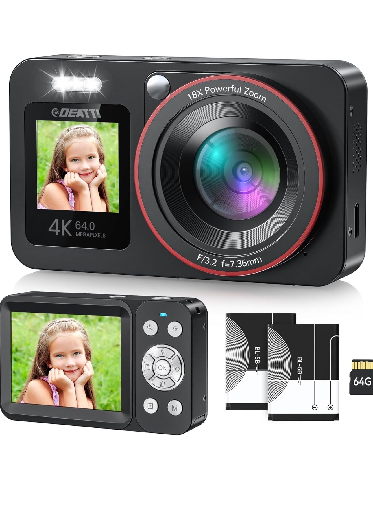 Dual Screens & Anti-Shake Design】Featuring a 1.4'' front HD display for perfect selfies(Press "OK" button 3S to transfer to selfies mode.) and a 2.8'' rear display for clear image, this vlogging camera meets all your shooting needs.With a built-in anti-shake function, you can effortlessly capture smooth and stable photos and videos every time. 【4K Ultra HD & 64MP Digital Camera】The DEATTI video camera delivers 4K video and 64MP photos, ensuring detailed and crystal-clear images. With 18X digital zoom, full-light function, and autofocus, it's a perfect photography cameras for beginners. 【Lightweight & Compact Design Camera】This travel-friendly camera fits effortlessly into your pocket or bag, ready for any moment of inspiration. Equipped with two batteries, you won't miss capturing special moments. Perfect for everything from mountain hikes to bustling markets, it's your ideal travel companion. 【Webcam for Live Streaming】This versatile camera doubles as a webcam for live streaming, video calls, or online tutorials on TikTok, YouTube, and Facebook. Easily transfer photos/videos to your computer or smartphone to share moments with loved ones. Perfect for vlogging, it helps you create engaging content and lasting memories. 【More Features of DEATTI Digital camera】Simply press and hold “OK” to switch to self-timer mode. Enjoy features like auto shutdown, image rotation, automatic picture taking, continuous shooting, zoom in/out, and various special effects. Explore and discover a range of functions designed to enhance your photography experience!