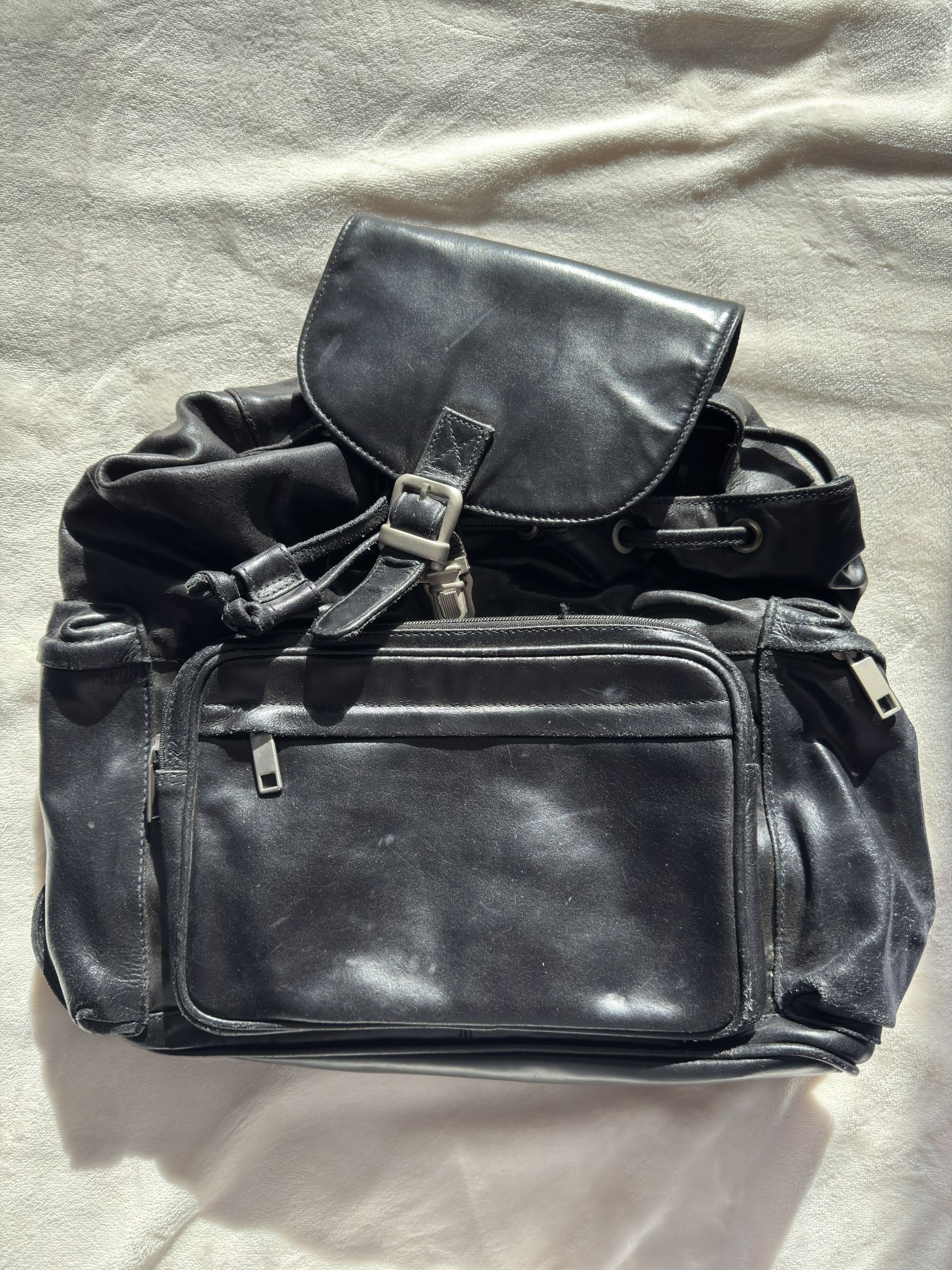 Drawstring closure in secure pewter circle rings, cinch up your backpack AND then snap in the front cover, sling it over your shoulders and be off! Spotless inside ππΌ