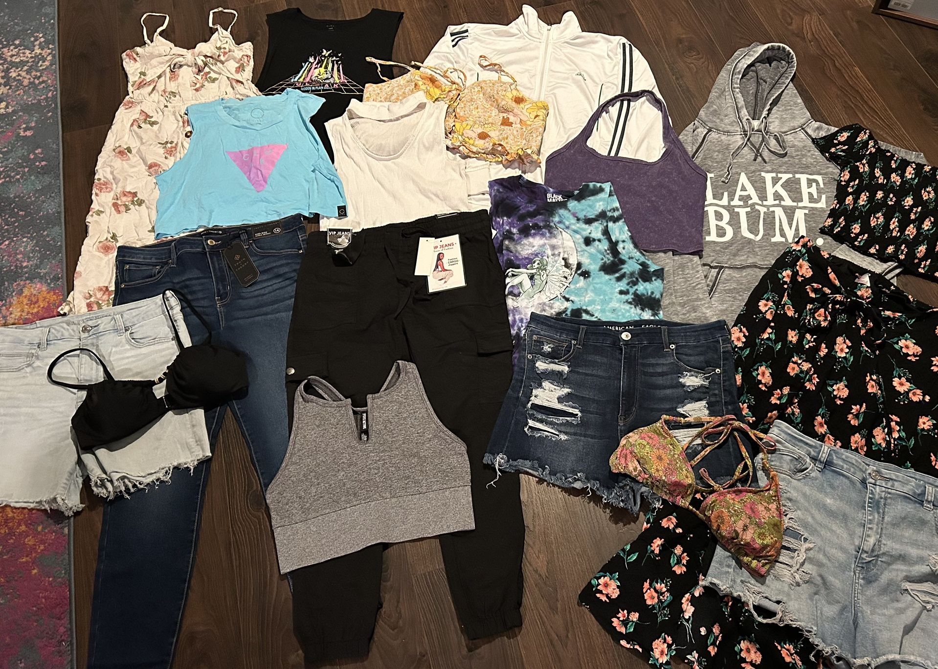 Women’s clothes bundle size XL and size 14. 20 pieces of clothing in total. 19 if you count the black floral skirt and crop top set as one article of clothing. All the clothes are in lightly preowned and almost like new condition except for the two pairs of pants and adidas full zip sweater. The pants are brand new with tags but the sweater is preowned and does have some staining. See pictures for details. Some brands included: Pink, American Eagle, Adidas.
