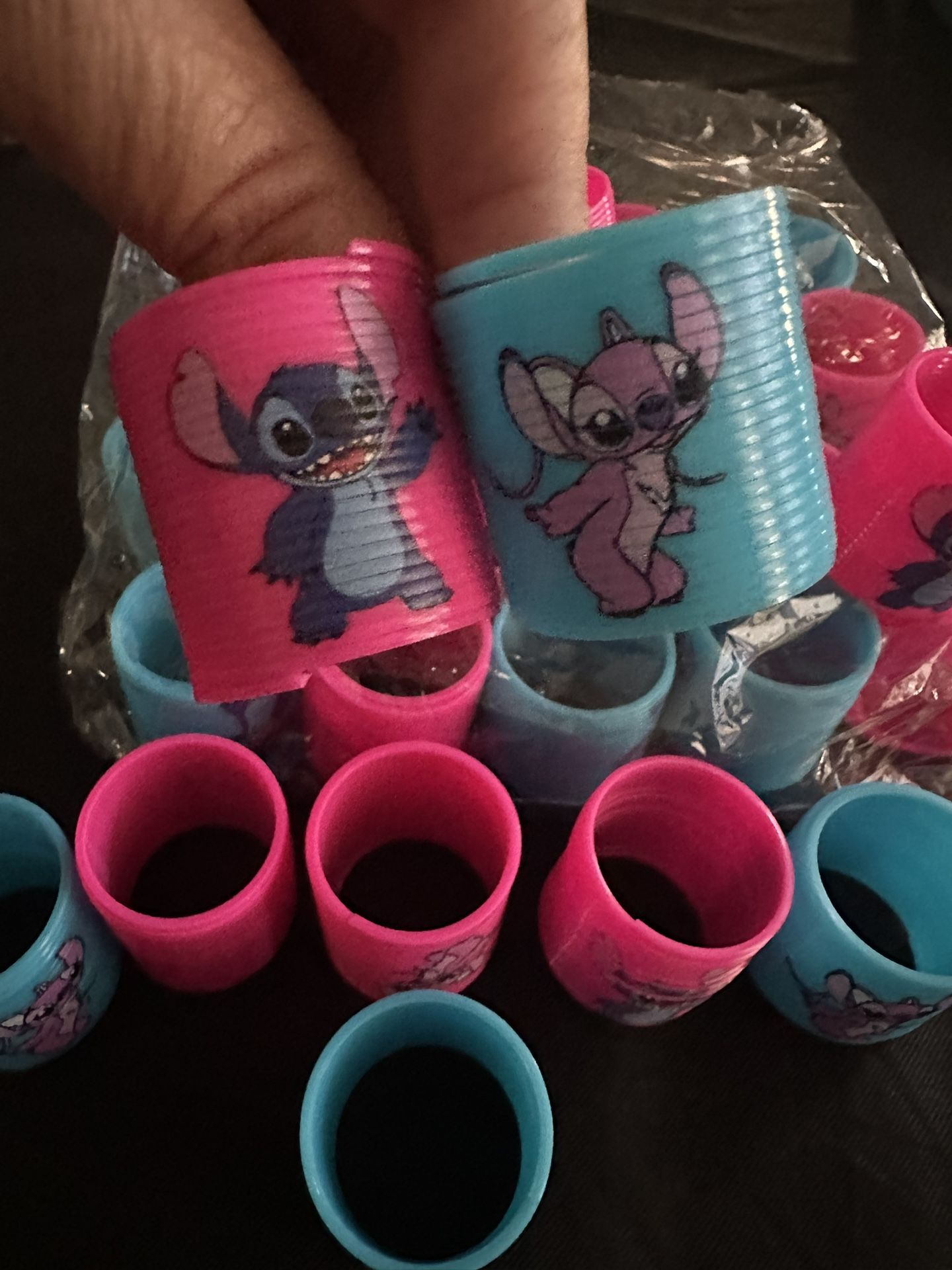 They come in a total of 36. It is stitch mini slinky’s. They are $10 each set. I have two sets.