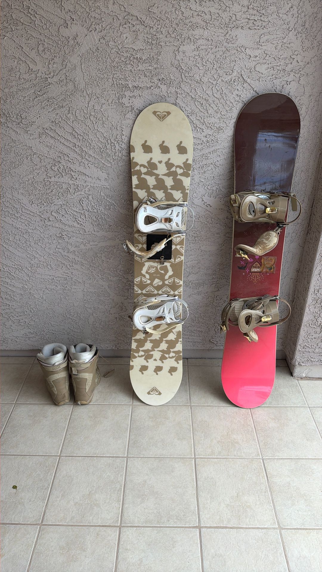 US 8.5 boot size. Roxy board is 147 cm, Burton board 151 cm