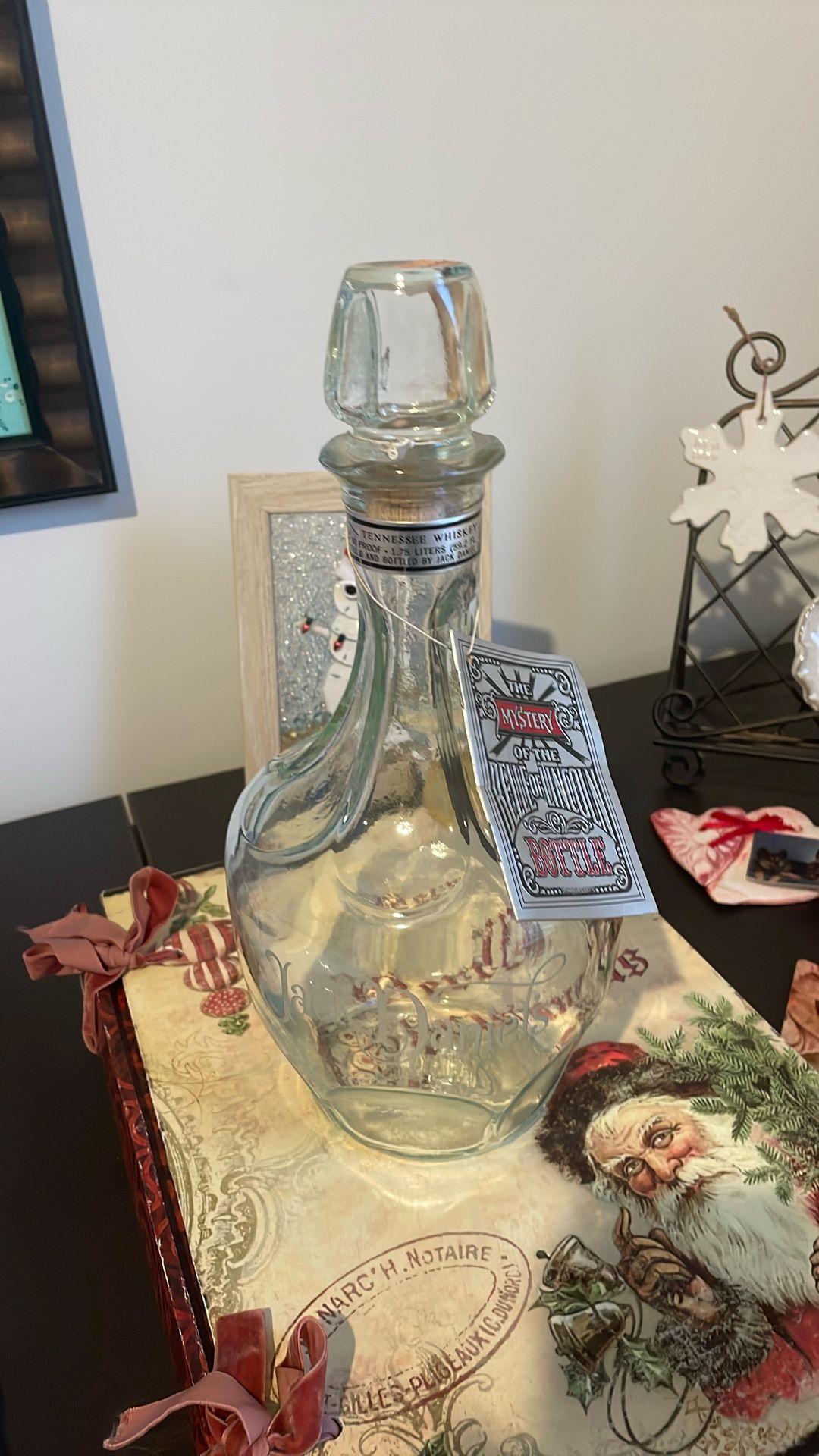 Jack Daniels 1.75 L etched decanter glass bottle with an commemorative tag